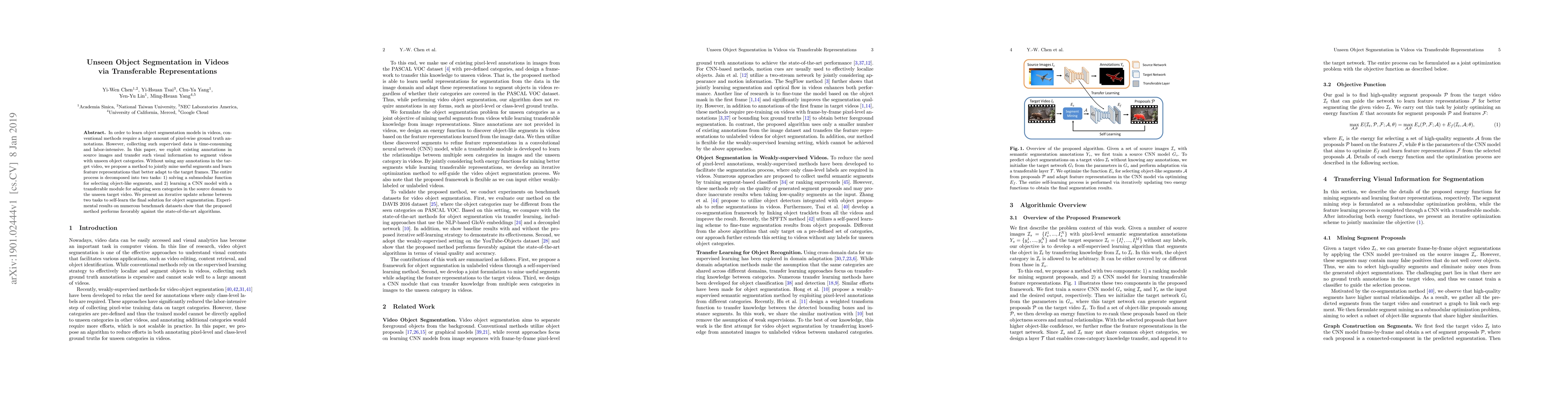 This paper proposes a method to segment unseen object categories in videos using transferable representations from annotated source images, without requiring any annotations in the target video. It combines segment selection and CNN adaptation in an iterative process, achieving competitive results on benchmark datasets.