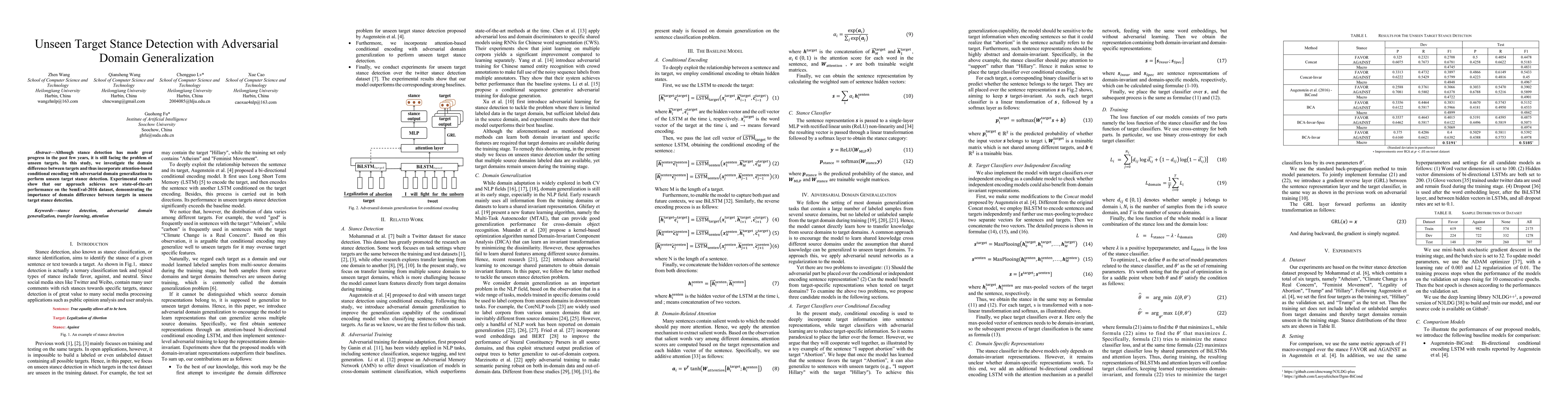 This paper proposes a novel method combining attention-based conditional encoding with adversarial domain generalization to tackle unseen target stance detection. The approach achieves state-of-the-art results on the SemEval-2016 dataset, highlighting the significance of domain differences between targets.