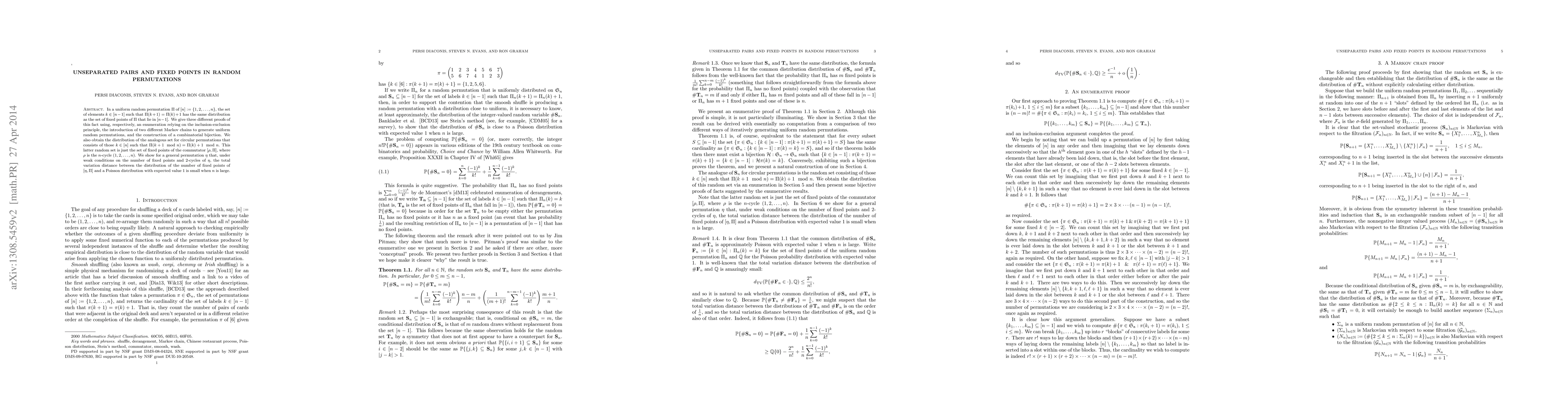 The paper provides multiple proofs for the equivalence of unseparated pairs and fixed points in random permutations, including an enumeration method, Markov chain construction, and a combinatorial bijection.