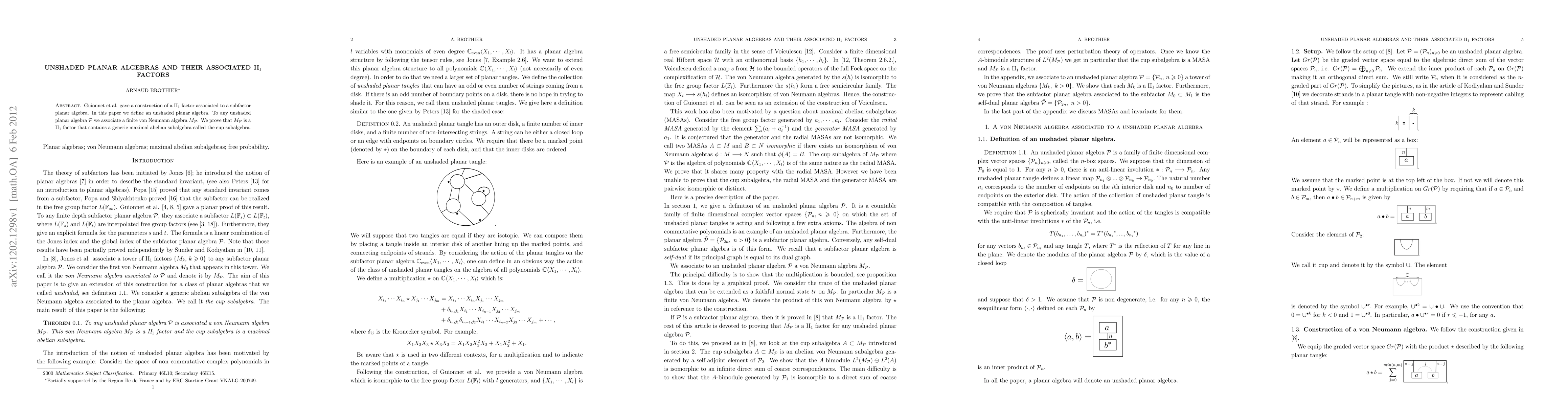 This paper constructs a II_1 factor from an unshaded planar algebra, showing that the resulting von Neumann algebra, denoted M_P, contains a generic maximal abelian subalgebra known as the cup subalgebra. The work extends previous constructions by Guionnet et al. for subfactor planar algebras.