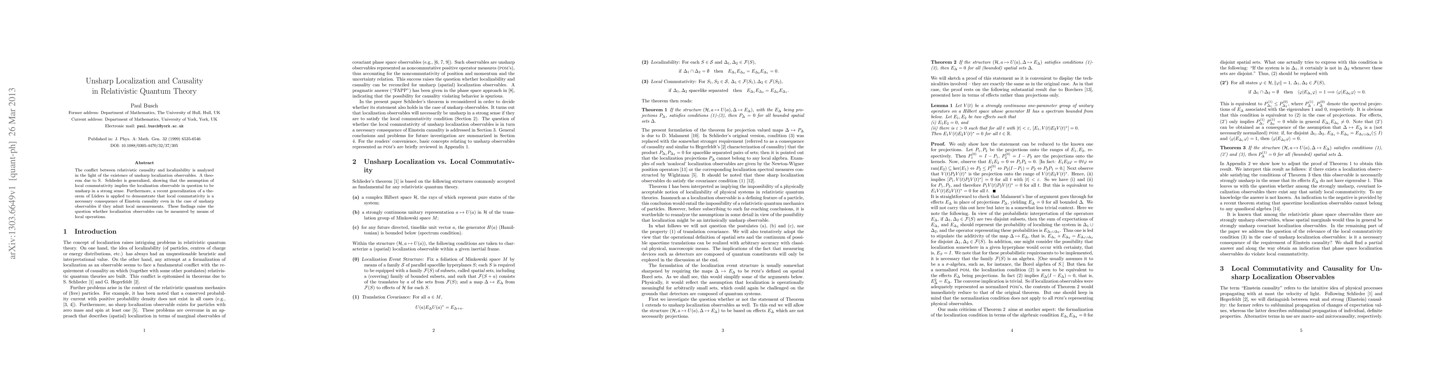 The conflict between relativistic causality and localizability is analyzed in the light of the existence of unsharp localization observables. A theorem due to S. Schlieder is generalized, showing that the assumption of local commutativity implies the localization observable in question to be unsharp in a strong sense. Furthermore, a recent generalization of a theorem of L\"uders is applied to demonstrate that local commutativity is a necessary consequence of Einstein causality even in the case of unsharp observables if they admit local measurements. These findings raise the question whether localization observables can be measured by means of local operations.