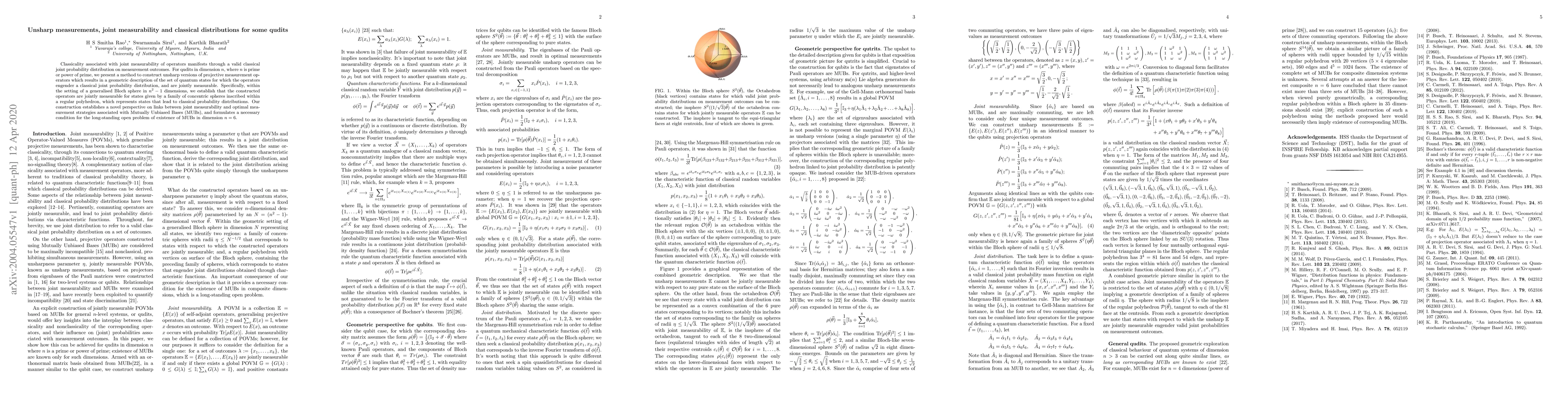 This paper presents a method to construct unsharp measurement operators for qudits in prime-dimensional spaces, showing they lead to classical joint probability distributions and are jointly measurable. It provides a geometric framework for understanding these states within a generalized Bloch sphere, offering insights into the relationship between joint measurability and Mutually Unbiased Bases, and proposes a condition for the existence of MUBs in dimension six.