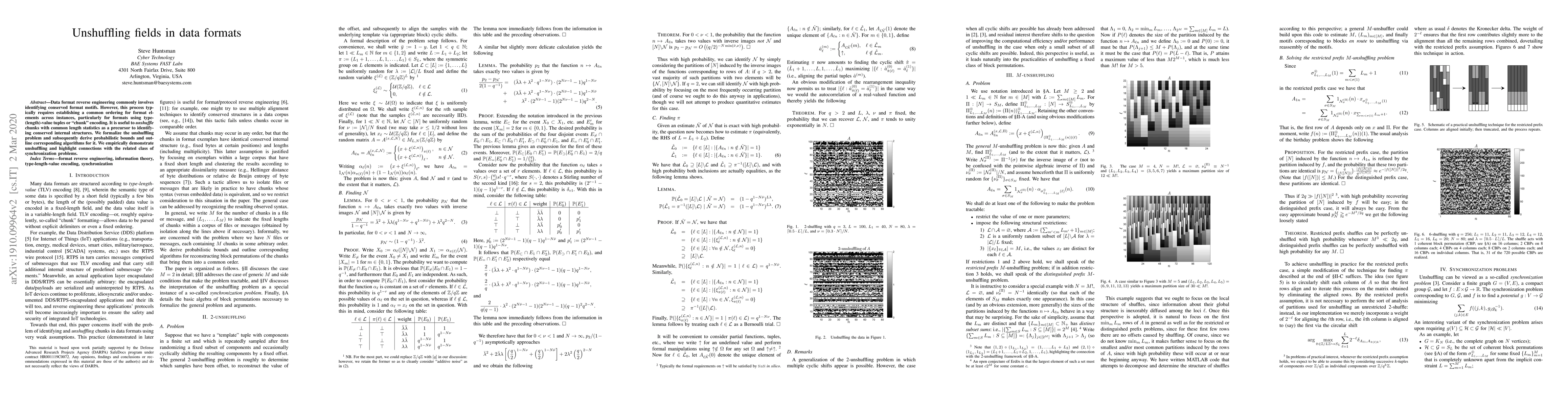 This research paper introduces a new problem called unshuffling fields in data formats, aiming to identify common internal structures across format elements. It provides probabilistic bounds and algorithms for the unshuffling problem and demonstrates its connection to synchronization problems.