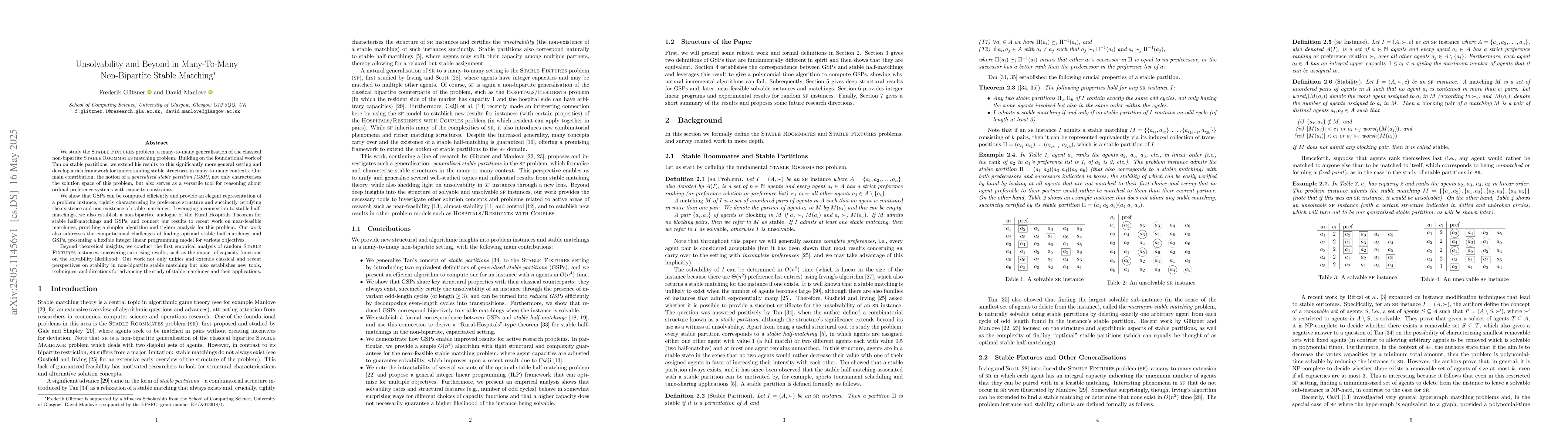 We study the Stable Fixtures problem, a many-to-many generalisation of the classical non-bipartite Stable Roommates matching problem. Building on the foundational work of Tan on stable partitions, we extend his results to this significantly more general setting and develop a rich framework for understanding stable structures in many-to-many contexts. Our main contribution, the notion of a generalised stable partition (GSP), not only characterises the solution space of this problem, but also serves as a versatile tool for reasoning about ordinal preference systems with capacity constraints. We show that GSPs can be computed efficiently and provide an elegant representation of a problem instance, tightly characterising its preference structure and succinctly certifying the existence and non-existence of stable matchings. Leveraging a connection to stable half matchings, we also establish a non-bipartite analogue of the Rural Hospitals Theorem for stable half-matchings and GSPs, and connect our results to recent work on near-feasible matchings, providing a simpler algorithm and tighter analysis for this problem. Our work also addresses the computational challenges of finding optimal stable half-matchings and GSPs, presenting a flexible integer linear programming model for various objectives. Beyond theoretical insights, we conduct the first empirical analysis of random Stable Fixtures instances, uncovering surprising results, such as the impact of capacity functions on the solvability likelihood. Our work not only unifies and extends classical and recent perspectives on stability in non-bipartite stable matching but also establishes new tools, techniques, and directions for advancing the study of stable matchings and their applications.
