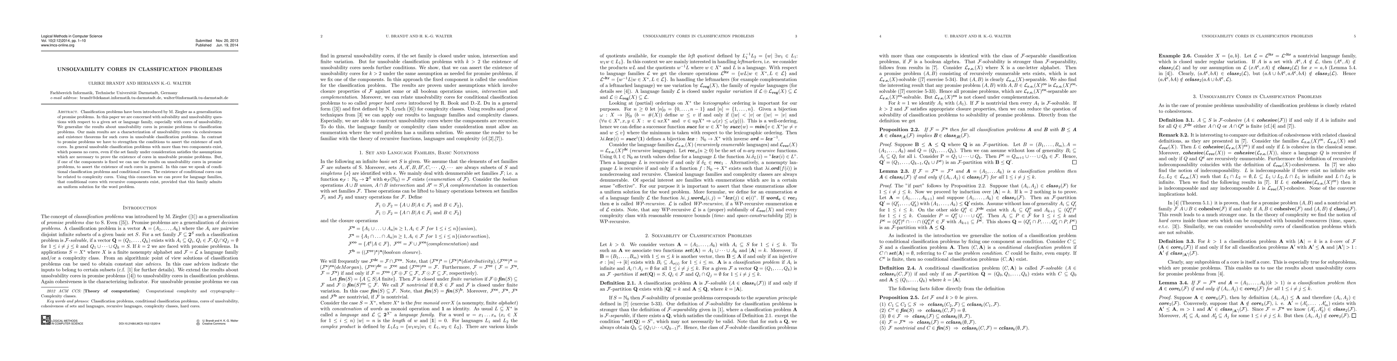 This paper generalizes unsolvability core concepts from promise problems to classification problems, characterizing them via cohesiveness. It proves existence theorems for unsolvability cores in unsolvable classification problems, noting that general unsolvable classification problems might lack cores. However, conditional cores, existing when one component is fixed, can relate to complexity cores, and their existence can be confirmed if a language family has a uniform solution for the word problem.