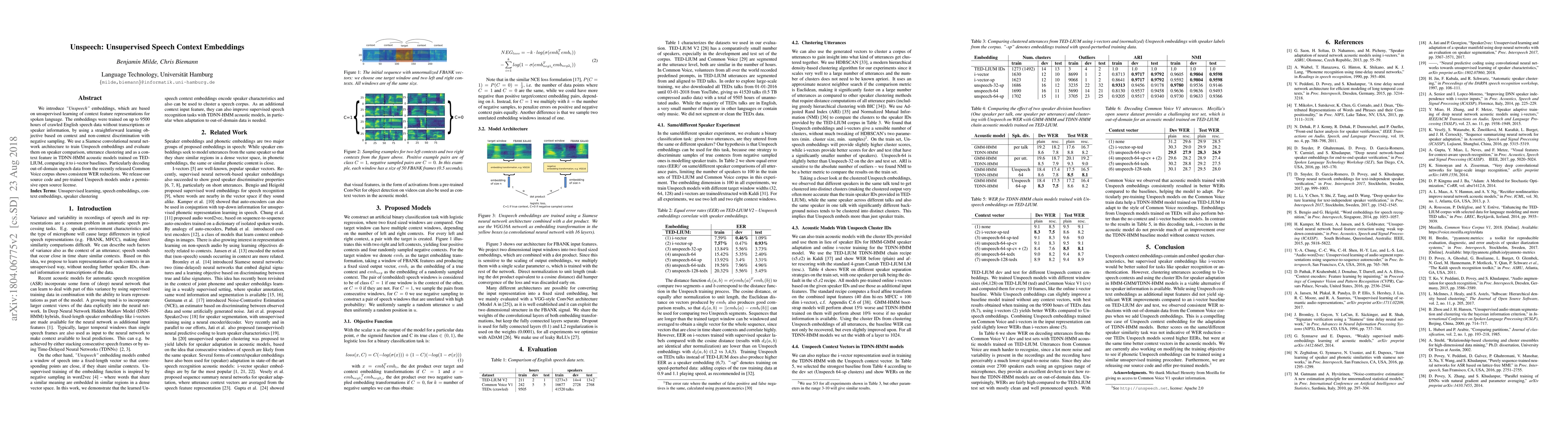 We introduce "Unspeech" embeddings, which are based on unsupervised learning of context feature representations for spoken language. The embeddings were trained on up to 9500 hours of crawled English speech data without transcriptions or speaker information, by using a straightforward learning objective based on context and non-context discrimination with negative sampling. We use a Siamese convolutional neural network architecture to train Unspeech embeddings and evaluate them on speaker comparison, utterance clustering and as a context feature in TDNN-HMM acoustic models trained on TED-LIUM, comparing it to i-vector baselines. Particularly decoding out-of-domain speech data from the recently released Common Voice corpus shows consistent WER reductions. We release our source code and pre-trained Unspeech models under a permissive open source license.
