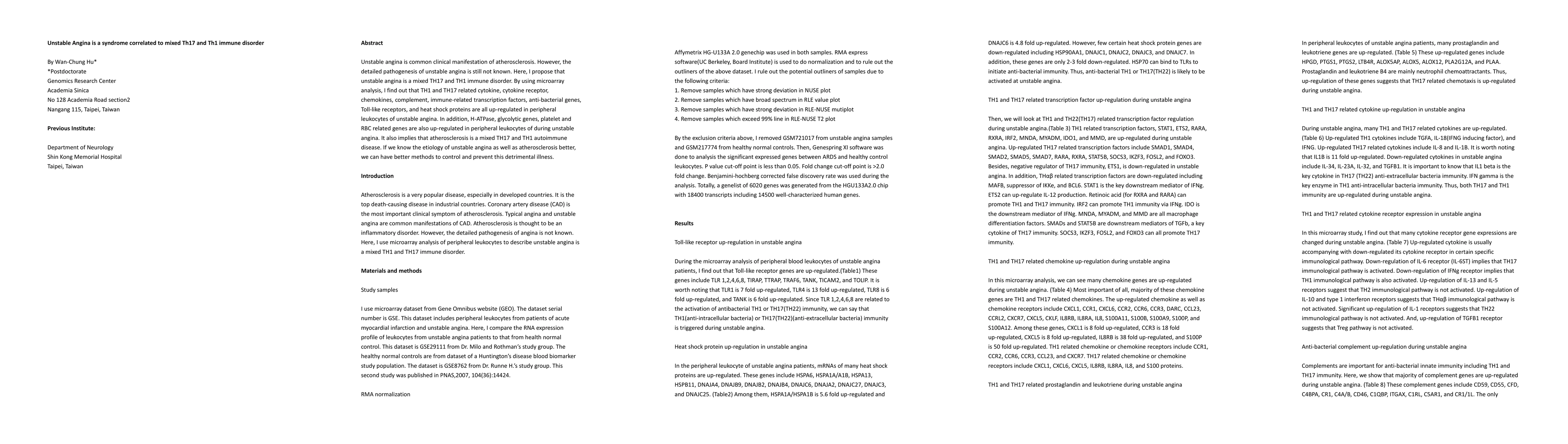 Unstable angina is common clinical manifestation of atherosclerosis. However, the detailed pathogenesis of unstable angina is still not known. Here, I propose that unstable angina is a mixed TH17 and TH1 immune disorder. By using microarray analysis, I find out that TH1 and TH17 related cytokine, cytokine receptor, chemokines, complement, immune-related transcription factors, anti-bacterial genes, Toll-like receptors, and heat shock proteins are all up-regulated in peripheral leukocytes of unstable angina. In addition, H-ATPase, glycolytic genes, platelet and RBC related genes are also up-regulated in peripheral leukocytes of during unstable angina. It also implies that atherosclerosis is a mixed TH17 and TH1 autoimmune disease. If we know the etiology of unstable angina as well as atherosclerosis better, we can have better methods to control and prevent this detrimental illness.