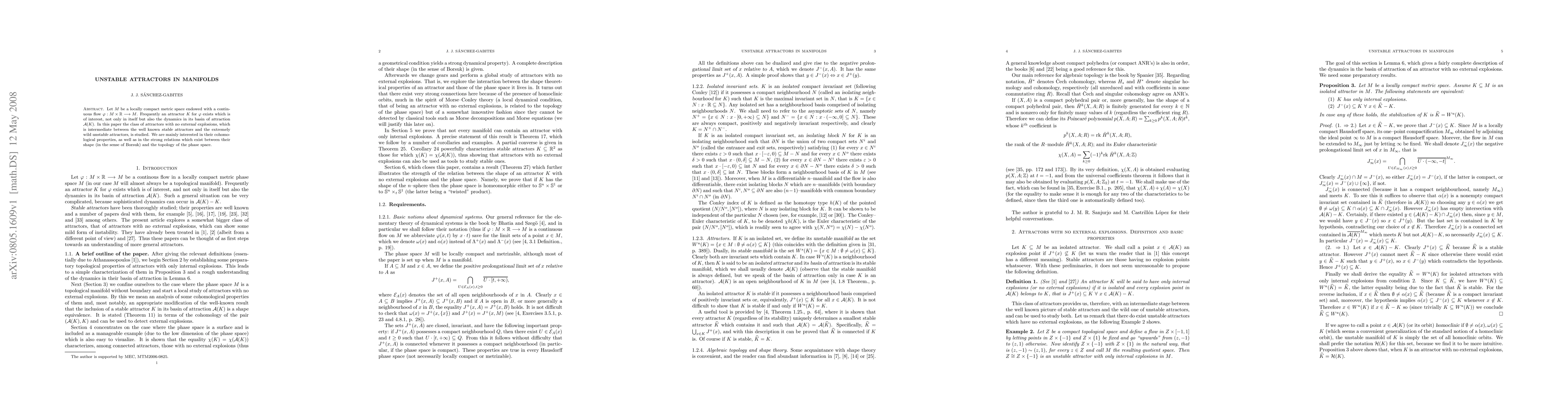 Let $M$ be a locally compact metric space endowed with a continuous flow $\phi : M \times \mathbb{R} \longrightarrow M$. Frequently an attractor $K$ for $\phi$ exists which is of interest, not only in itself but also the dynamics in its basin of attraction $\mathcal{A}(K)$. In this paper the class of {\sl attractors with no external explosions}, which is intermediate between the well known {\sl stable attractors} and the extremely wild {\sl unstable attractors}, is studied. We are mainly interested in their cohomological properties, as well as in the strong relations which exist between their shape (in the sense of Borsuk) and the topology of the phase space.