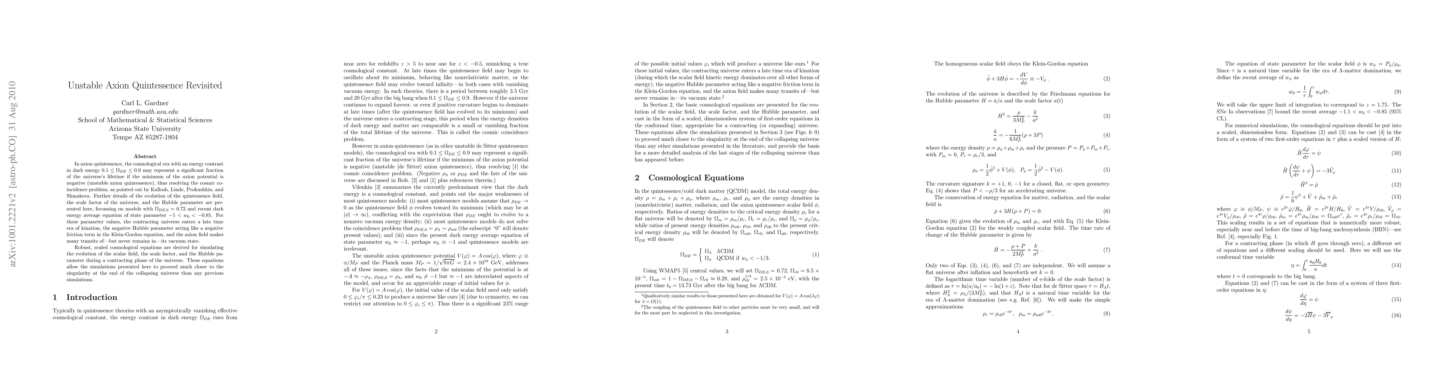 In axion quintessence, the cosmological era with an energy contrast in dark energy 0.1 < Omega_DE < 0.9 may represent a significant fraction of the universe's lifetime if the minimum of the axion potential is negative (unstable axion quintessence), thus resolving the cosmic coincidence problem, as pointed out in Ref. [1]. Further details of the evolution of the quintessence field, the scale factor of the universe, and the Hubble parameter are presented here, focussing on models with Omega_DE,0 = 0.72 and recent dark energy average equation of state parameter -1 < w_0 < -0.85. For these parameter values, the contracting universe enters a late time era of kination, the negative Hubble parameter acting like a negative friction term in the Klein-Gordon equation, and the axion field makes many transits of--but never remains in--its vacuum state. Robust, scaled cosmological equations are derived for simulating the evolution of the scalar field, the scale factor, and the Hubble parameter during a contracting phase of the universe. These equations allow the simulations presented here to proceed much closer to the singularity at the end of the collapsing universe than any previous simulations.