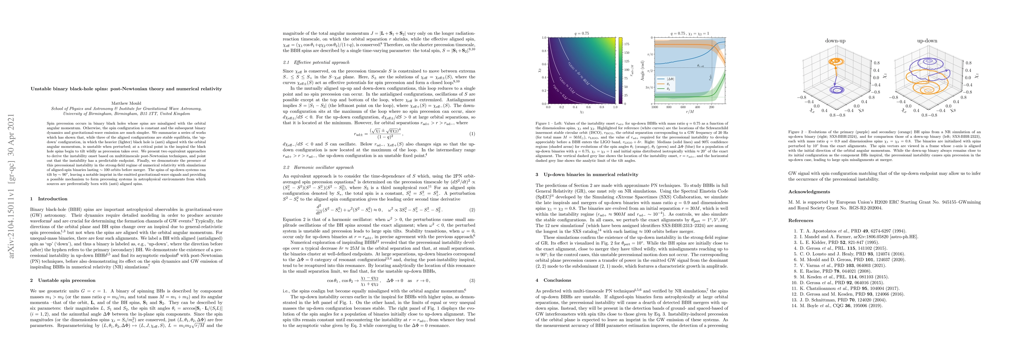 Spin precession occurs in binary black holes whose spins are misaligned with the orbital angular momentum. Otherwise, the spin configuration is constant and the subsequent binary dynamics and gravitational-wave emission are much simpler. We summarize a series of works which has shown that, while three of the aligned configurations are stable equilibria, the `up-down' configuration, in which the heavier (lighter) black hole is (anti) aligned with the orbital angular momentum, is unstable when perturbed; at a critical point in the inspiral the black hole spins begin to tilt wildly as precession takes over. We present two equivalent approaches to derive the instability onset based on multitimescale post-Newtonian techniques, and point out that the instability has a predictable endpoint. Finally, we demonstrate the presence of this precessional instability in the strong-field regime of numerical relativity with simulations of aligned-spin binaries lasting $\sim100$ orbits before merger. The spins of up-down systems can tilt by $\sim90^\circ$, leaving a notable imprint in the emitted gravitational-wave signals and providing a possible mechanism to form precessing systems in astrophysical environments from which sources are preferentially born with (anti) aligned spins.