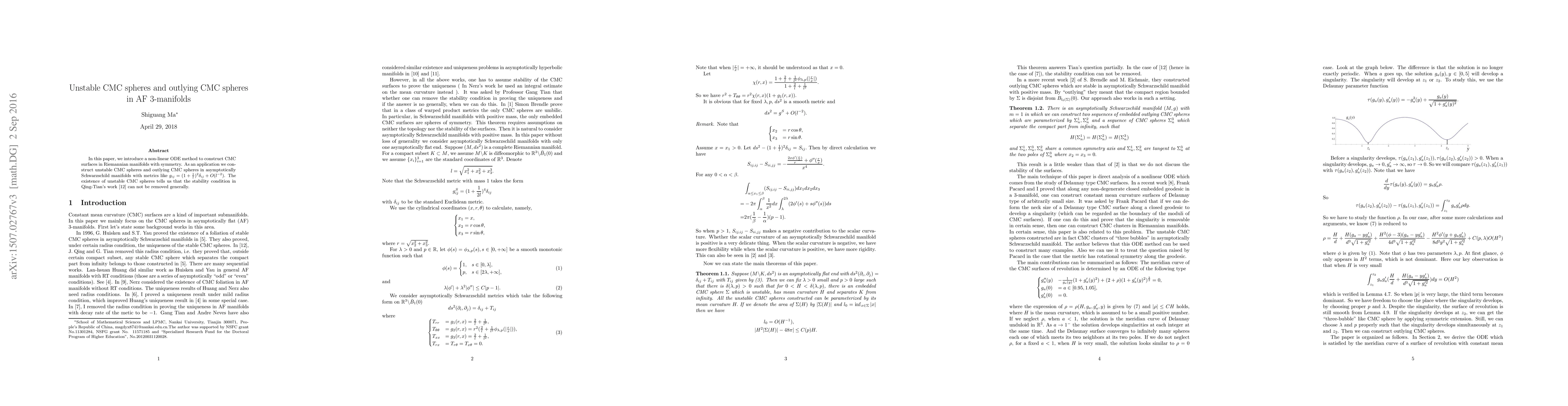 This paper develops a nonlinear ODE method to construct Constant Mean Curvature (CMC) surfaces in symmetric Riemannian manifolds, specifically focusing on unstable and outlying CMC spheres in asymptotically Schwarzschild manifolds. The findings indicate that the stability condition in Qing-Tian's work cannot be generally disregarded.