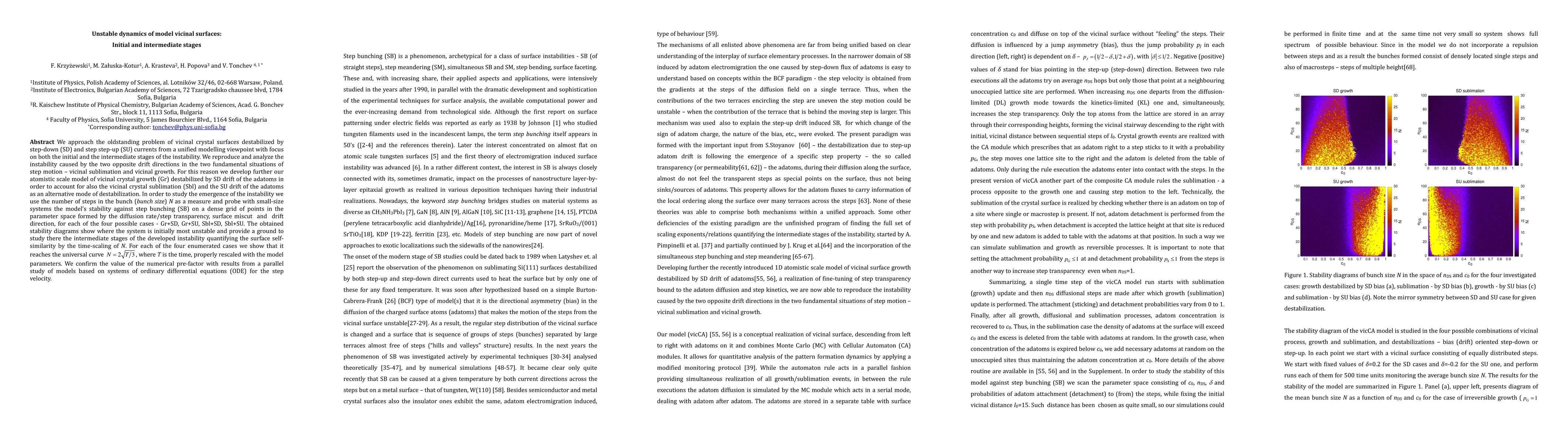 We approach the old-standing problem of vicinal crystal surfaces destabilized by step-down and step step-up currents from a unified modelling viewpoint with focus on both the initial and the intermediate stages of the instability. We develop further our atomistic scale model of vicinal crystal growth (Gr) destabilized by SD drift of the adatoms in order to account for also the vicinal crystal sublimation (Sbl) and the SU drift of the adatoms as an alternative mode of destabilization. In order to study the emergence of the instability we use the number of steps in the bunch (bunch size) N as a measure and probe with small-size systems the models stability against step bunching (SB) on a dense grid of points in the parameter space formed by the diffusion rate/step transparency, surface miscut and drift direction, for each of the four possible cases - Gr+SD, Gr+SU, Sbl+SD, Sbl+SU. The obtained stability diagrams show where the system is initially most unstable and provide a ground to study there the intermediate stages of the developed instability quantifying the surface self-similarity by the time-scaling of N. For each of the four enumerated cases we show that it reaches the universal curve N=2sqrt(T/3), where T is the time, properly rescaled with the model parameters. We confirm the value of the numerical pre-factor with results from a parallel study of models based on systems of ordinary differential equations (ODE) for the step velocity.