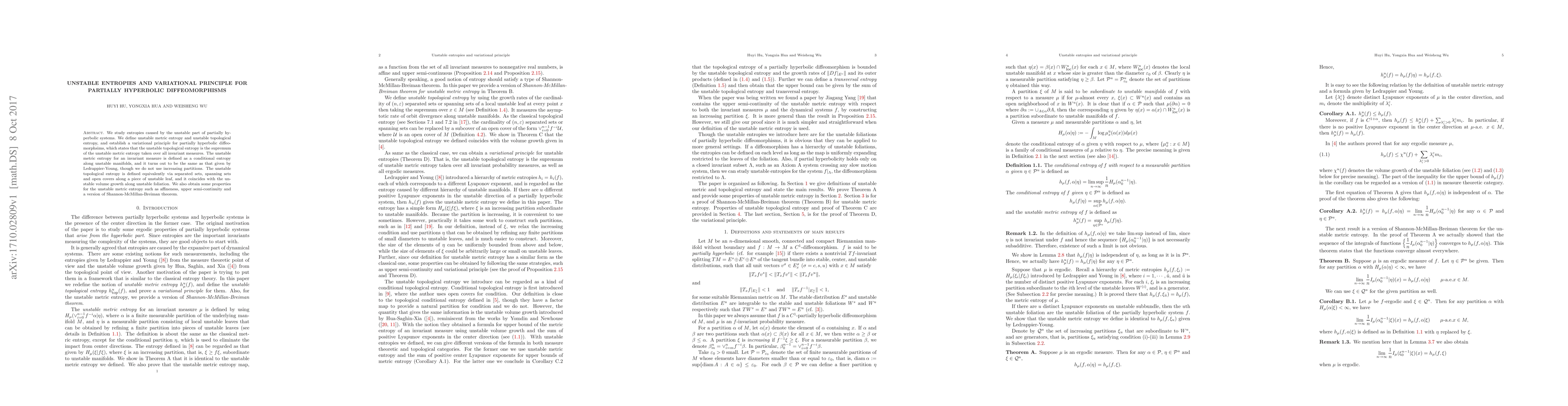 This paper defines unstable metric and topological entropies for partially hyperbolic diffeomorphisms, establishing a variational principle where the unstable topological entropy equals the supremum of unstable metric entropy over invariant measures. It also proves properties like affineness and upper semi-continuity for the unstable metric entropy.
