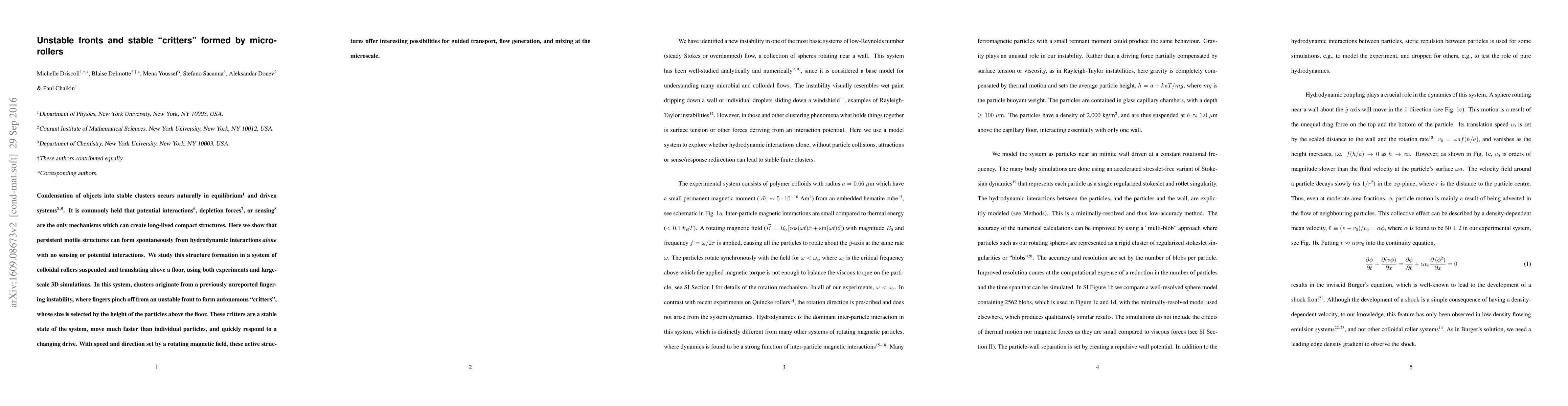 Condensation of objects into stable clusters occurs naturally in equilibrium and driven systems. It is commonly held that potential interactions, depletion forces, or sensing are the only mechanisms which can create long-lived compact structures. Here we show that persistent motile structures can form spontaneously from hydrodynamic interactions alone with no sensing or potential interactions. We study this structure formation in a system of colloidal rollers suspended and translating above a floor, using both experiments and large-scale 3D simulations. In this system, clusters originate from a previously unreported fingering instability, where fingers pinch off from an unstable front to form autonomous "critters", whose size is selected by the height of the particles above the floor. These critters are a stable state of the system, move much faster than individual particles, and quickly respond to a changing drive. With speed and direction set by a rotating magnetic field, these active structures offer interesting possibilities for guided transport, flow generation, and mixing at the microscale.