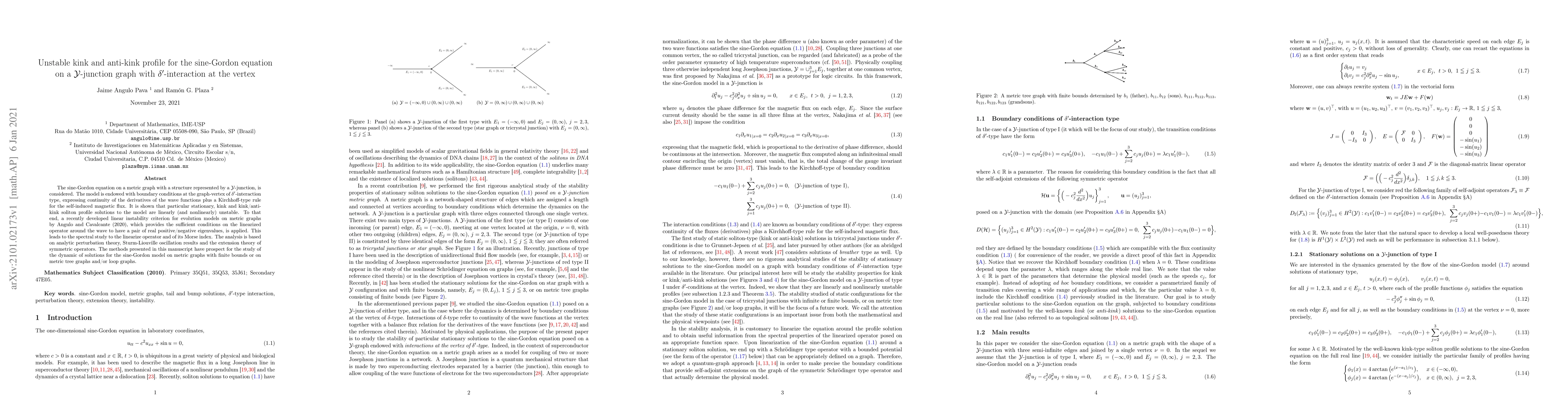 The sine-Gordon equation on a metric graph with a structure represented by a $\mathcal{Y}$-junction, is considered. The model is endowed with boundary conditions at the graph-vertex of $\delta'$-interaction type, expressing continuity of the derivatives of the wave functions plus a Kirchhoff-type rule for the self-induced magnetic flux. It is shown that particular stationary, kink and kink/anti-kink soliton profile solutions to the model are linearly (and nonlinearly) unstable. To that end, a recently developed linear instability criterion for evolution models on metric graphs by Angulo and Cavalcante (2020), which provides the sufficient conditions on the linearized operator around the wave to have a pair of real positive/negative eigenvalues, is applied. This leads to the spectral study to the linearize operator and of its Morse index. The analysis is based on analytic perturbation theory, Sturm-Liouville oscillation results and the extension theory of symmetric operators. The methods presented in this manuscript have prospect for the study of the dynamic of solutions for the sine-Gordon model on metric graphs with finite bounds or on metric tree graphs and/or loop graphs.