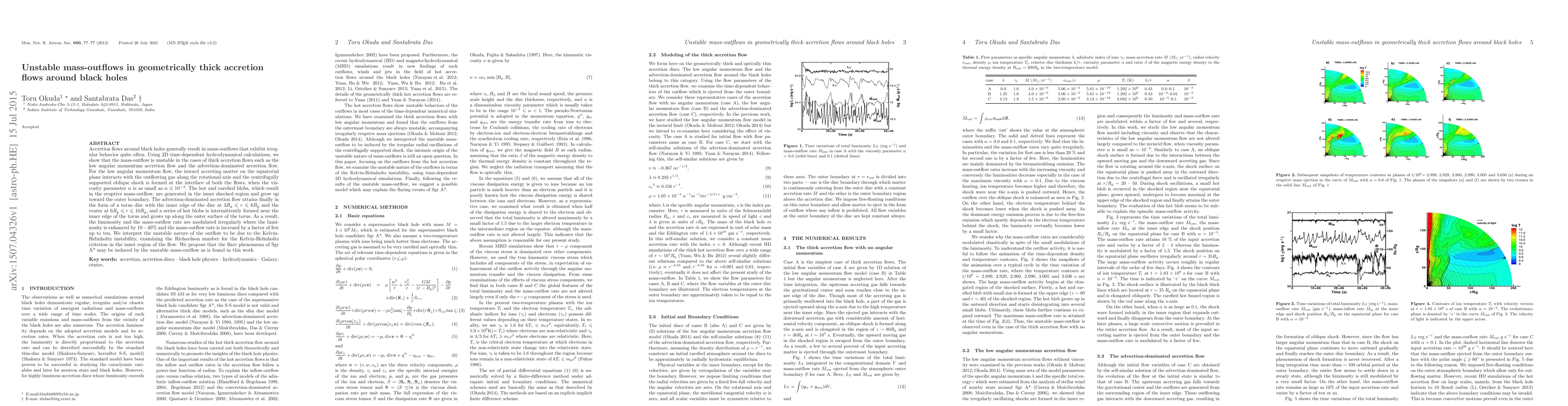 The research uses 2D hydrodynamical calculations to demonstrate that mass-outflows in thick accretion flows around black holes, like low angular momentum and advection-dominated accretion flows, are unstable. This instability generates eruptive mass-outflows and hot blobs, modulating luminosity and mass-outflow rate irregularly. The unstable nature is attributed to the Kelvin-Helmholtz instability, suggesting it could explain flare phenomena of Sgr A*.
