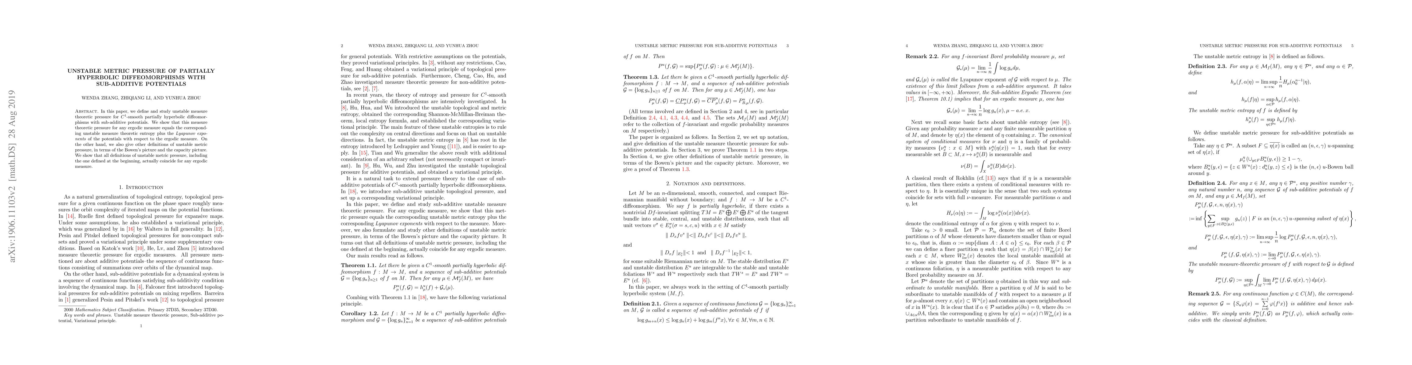 In this paper, we define and study unstable measure theoretic pressure for C^1-smooth partially hyperbolic diffeomorphisms with sub-additive potentials. For any ergodic measure, we show that this unstable metric pressure equals the corresponding unstable measure theoretic entropy plus the Lyapunov exponents with respect to the ergodic measure. On the other hand, we also define unstable topological and metric pressure in terms of the Bowen's picture and the capacity picture. We show that all these definitions of unstable metric pressure actually coincide for any ergodic measure.
