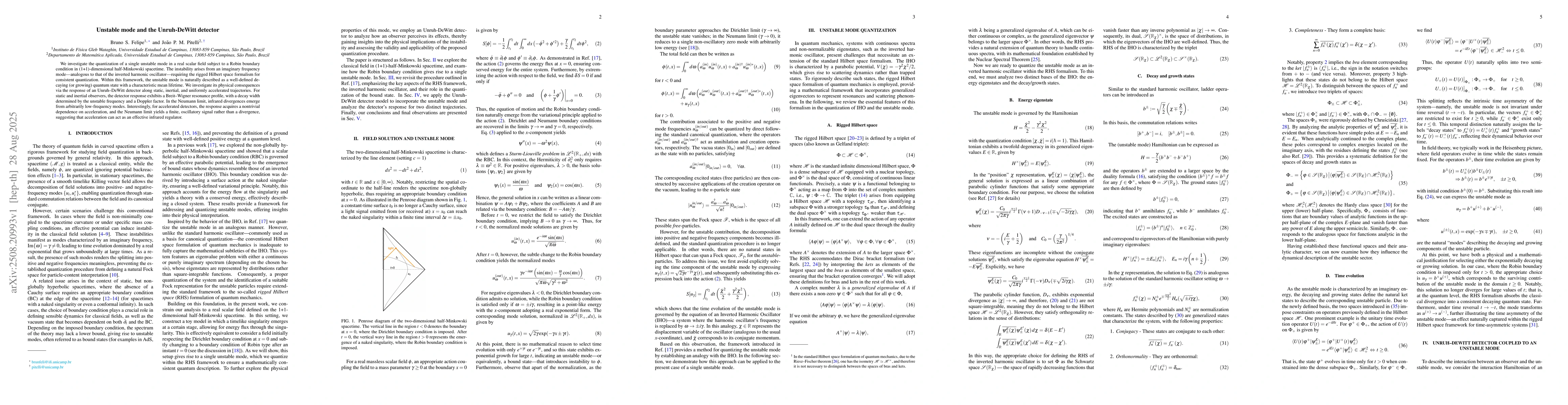 We investigate the quantization of a single unstable mode in a real scalar field subject to a Robin boundary condition in (1+1)-dimensional half-Minkowski spacetime. The instability arises from an imaginary frequency mode - analogous to that of the inverted harmonic oscillator - requiring the rigged Hilbert space formalism for consistent quantization. Within this framework, the unstable mode is naturally described as a well-defined decaying (or growing) quantum state with a characteristic mean lifetime. We investigate its physical consequences via the response of an Unruh-DeWitt detector along static, inertial, and uniformly accelerated trajectories. For static and inertial observers, the detector response exhibits a Breit-Wigner resonance profile, with a decay width determined by the unstable frequency and a Doppler factor. In the Neumann limit, infrared divergences emerge from arbitrarily low-frequency modes. Interestingly, for accelerated detectors, the response acquires a nontrivial dependence on acceleration, and the Neumann limit yields a finite, oscillatory signal rather than a divergence, suggesting that acceleration can act as an effective infrared regulator.