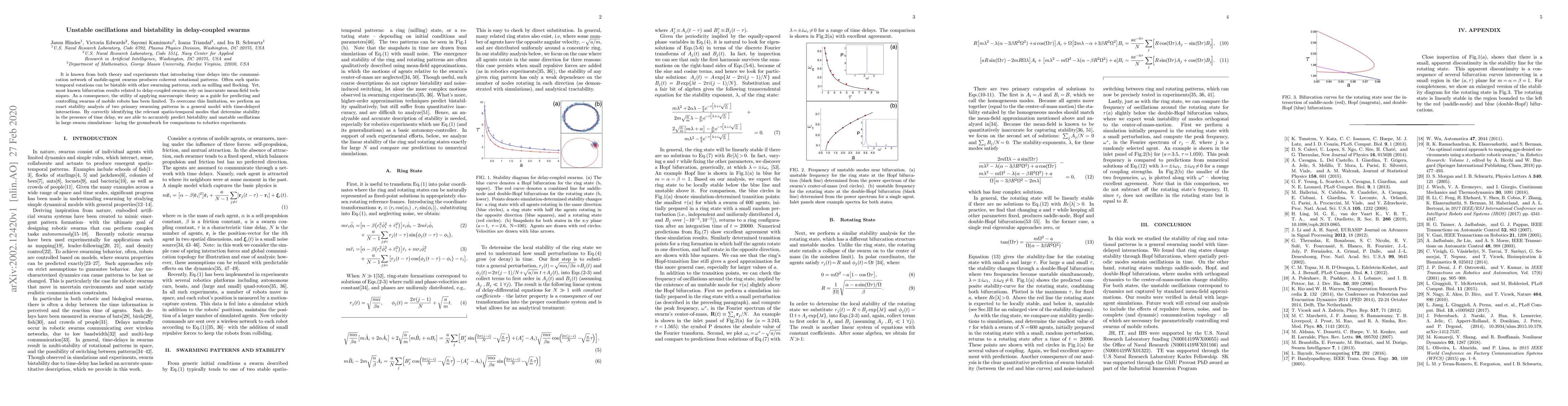 It is known from both theory and experiments that introducing time delays into the communication network of mobile-agent swarms produces coherent rotational patterns. Often such spatio-temporal rotations can be bistable with other swarming patterns, such as milling and flocking. Yet, most known bifurcation results related to delay-coupled swarms rely on inaccurate mean-field techniques. As a consequence, the utility of applying macroscopic theory as a guide for predicting and controlling swarms of mobile robots has been limited. To overcome this limitation, we perform an exact stability analysis of two primary swarming patterns in a general model with time-delayed interactions. By correctly identifying the relevant spatio-temporal modes that determine stability in the presence of time delay, we are able to accurately predict bistability and unstable oscillations in large swarm simulations-- laying the groundwork for comparisons to robotics experiments.