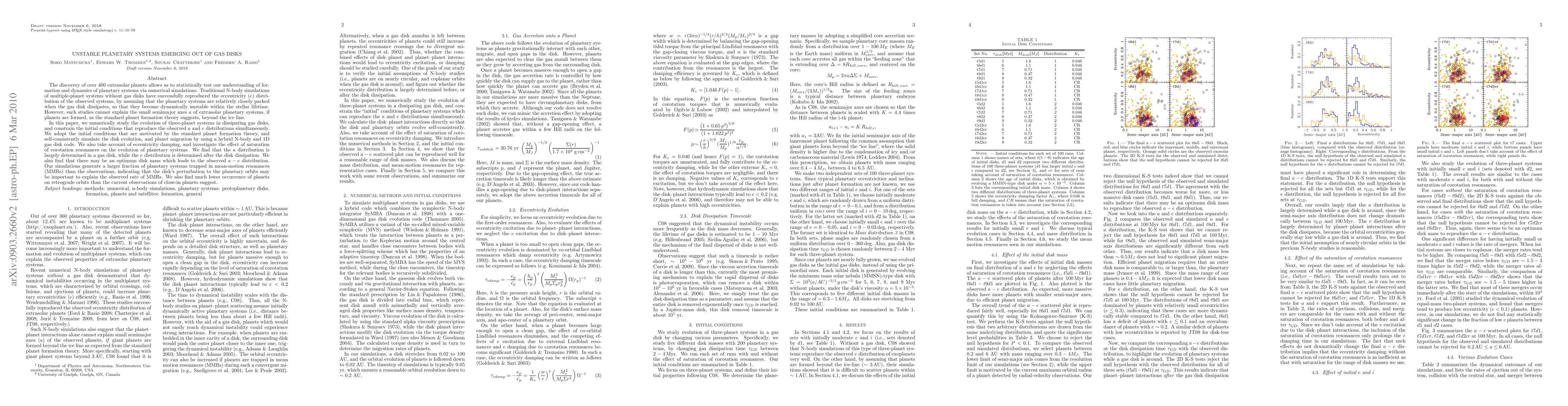 This paper investigates the evolution of three-planet systems in dissipating gas disks to understand the formation and dynamics of extrasolar planetary systems. The study finds that the semi-major axis distribution is shaped in the gas disk, while eccentricity is determined post-dissipation, suggesting an optimal disk mass for matching observed distributions.