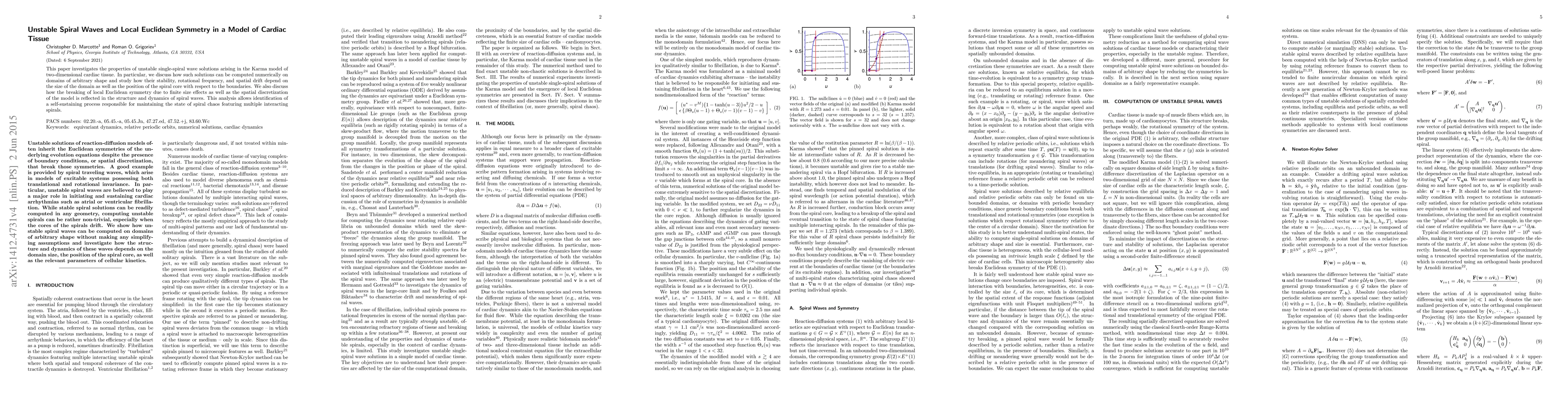 This paper examines unstable spiral wave solutions in the Karma model of cardiac tissue, focusing on their numerical computation, stability, and dynamics on arbitrary domains. It highlights how local Euclidean symmetry is disrupted by domain size and discretization, leading to spiral chaos with multiple interacting spirals.
