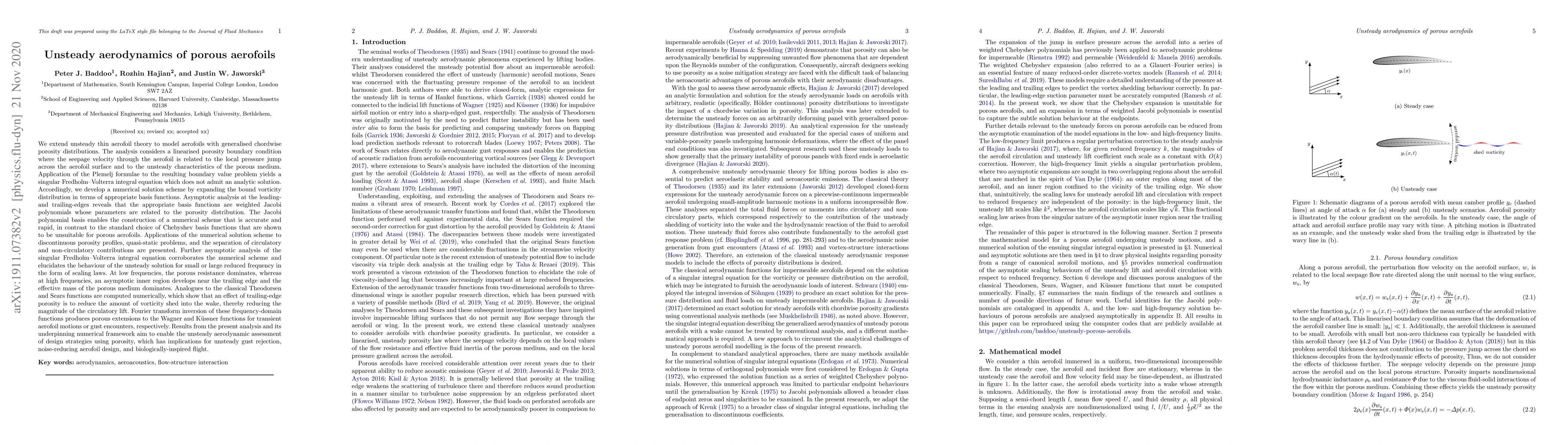 We extend unsteady thin aerofoil theory to model aerofoils with generalised chordwise porosity distributions. The analysis considers a linearised porosity boundary condition where the seepage velocity through the aerofoil is related to the local pressure jump across the aerofoil surface and to the unsteady characteristics of the porous medium. Application of the Plemelj formulae to the resulting boundary value problem yields a singular Fredholm--Volterra integral equation which does not admit an analytic solution. Accordingly, we develop a numerical solution scheme by expanding the bound vorticity distribution in terms of appropriate basis functions. Asymptotic analysis at the leading- and trailing-edges reveals that the appropriate basis functions are weighted Jacobi polynomials whose parameters are related to the porosity distribution. The Jacobi polynomial basis enables the construction of a numerical scheme that is accurate and rapid, in contrast to the standard choice of Chebyshev basis functions that are shown to {be unsuitable} for porous aerofoils. Applications of the numerical solution scheme to discontinuous porosity profiles, quasi-static problems, and the separation of circulatory and non-circulatory contributions are presented. Analogues to the classical Theodorsen and Sears functions are computed numerically, which show that an effect of trailing-edge porosity is to reduce the amount of vorticity shed into the wake, thereby reducing the magnitude of the circulatory lift. {Fourier transform inversion of these frequency-domain functions produces porous extensions to the Wagner and K\"{u}ssner functions for transient aerofoil motions or gust encounters, respectively.}
