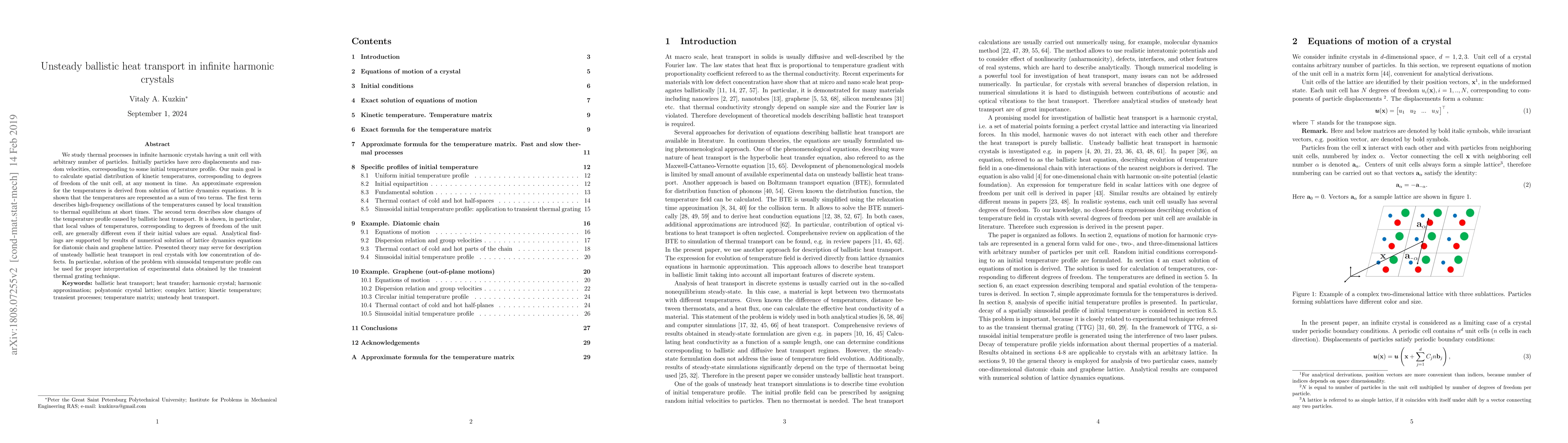 This paper investigates unsteady ballistic heat transport in infinite harmonic crystals using lattice dynamics equations. It derives an expression for kinetic temperatures in unit cells, showing two distinct terms: high-frequency oscillations and slow temperature profile changes due to ballistic transport. Numerical simulations support the analytical findings.