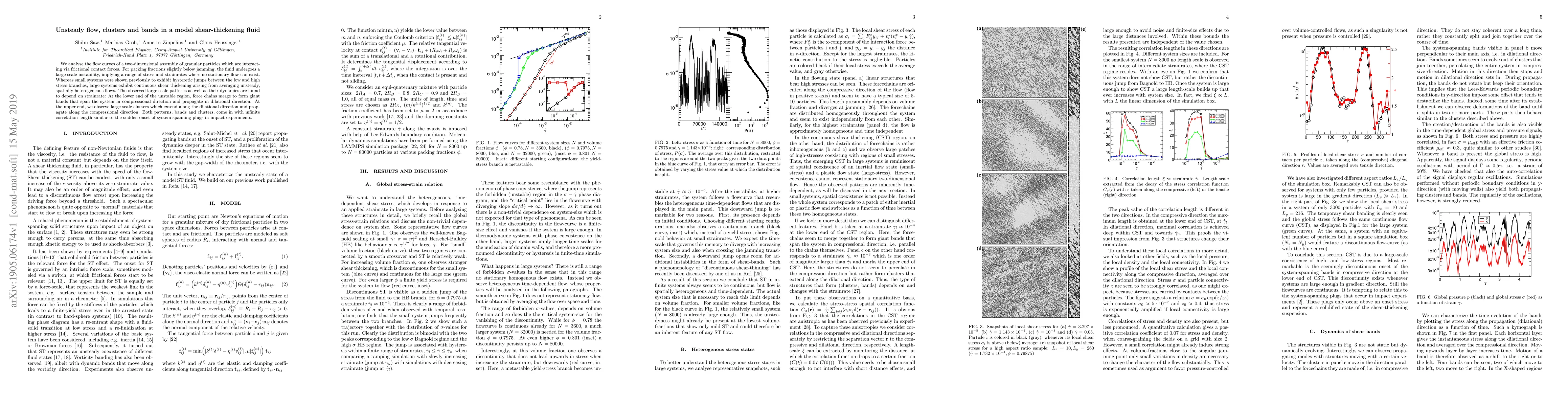 We analyse the flow curves of a two-dimensional assembly of granular particles which are interacting via frictional contact forces. For packing fractions slightly below jamming, the fluid undergoes a large scale instability, implying a range of stress and strainrates where no stationary flow can exist. Whereas small systems were shown previously to exhibit hysteretic jumps between the low and high stress branches, large systems exhibit continuous shear thickening arising from averaging unsteady, spatially heterogeneous flows. The observed large scale patterns as well as their dynamics are found to depend on strainrate: At the lower end of the unstable region, force chains merge to form giant bands that span the system in compressional direction and propagate in dilational direction. At the upper end, we observe large scale clusters which extend along the dilational direction and propagate along the compressional direction. Both patterns, bands and clusters, come in with infinite correlation length similar to the sudden onset of system-spanning plugs in impact experiments.