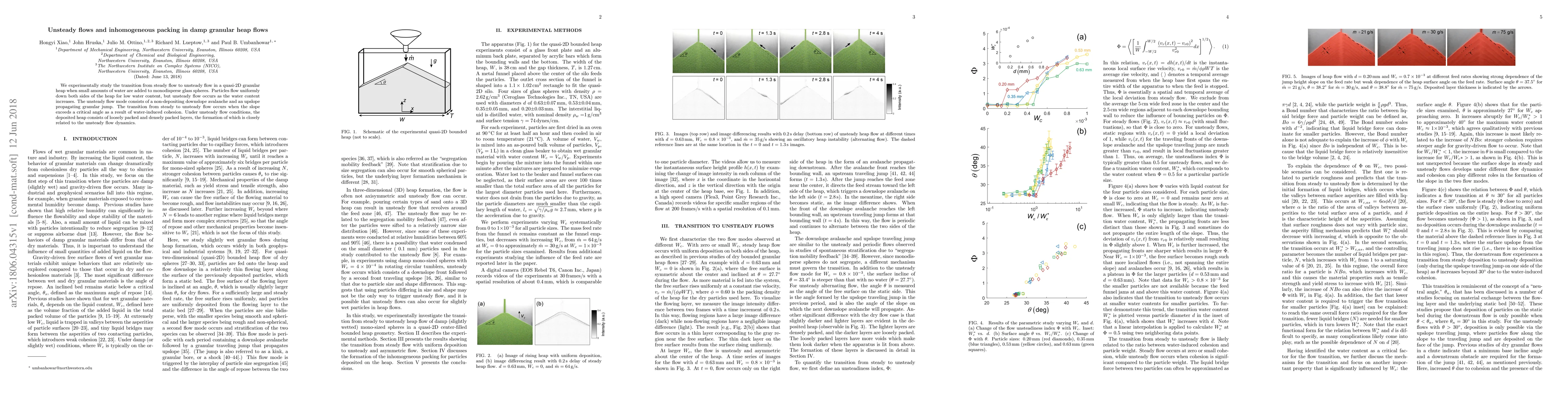 We experimentally study the transition from steady flow to unsteady flow in a quasi-2D granular heap when small amounts of water are added to monodisperse glass spheres. Particles flow uniformly down both sides of the heap for low water content, but unsteady flow occurs as the water content increases. The unsteady flow mode consists of a non-depositing downslope avalanche and an upslope propagating granular jump. The transition from steady to unsteady flow occurs when the slope exceeds a critical angle as a result of water-induced cohesion. Under unsteady flow conditions, the deposited heap consists of loosely packed and densely packed layers, the formation of which is closely related to the unsteady flow dynamics.