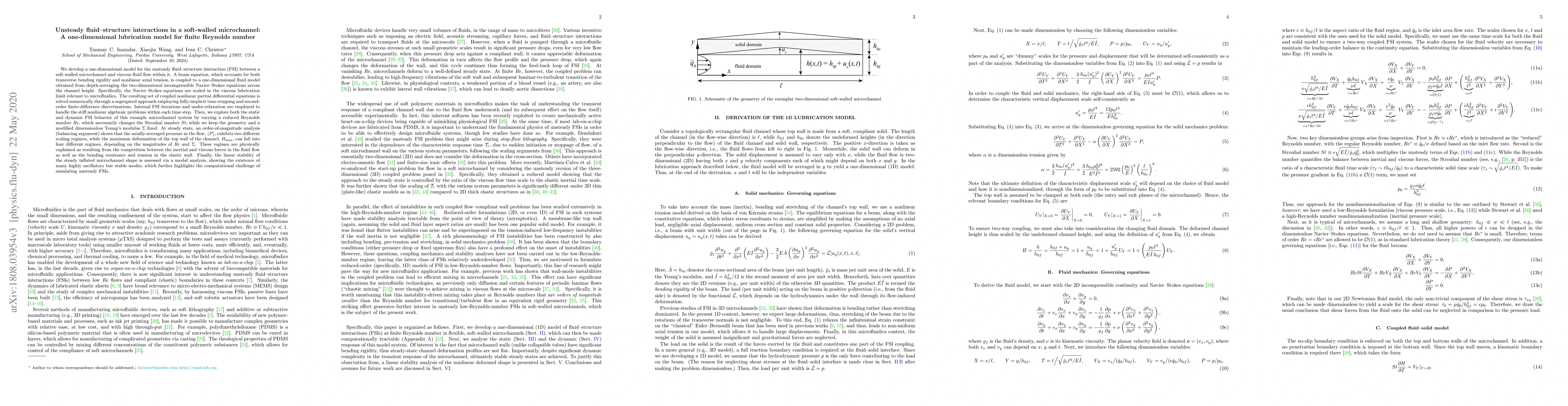 We develop a one-dimensional model for the unsteady fluid--structure interaction (FSI) between a soft-walled microchannel and viscous fluid flow within it. A beam equation, which accounts for both transverse bending rigidity and nonlinear axial tension, is coupled to a one-dimensional fluid model obtained from depth-averaging the two-dimensional incompressible Navier--Stokes equations across the channel height. Specifically, the Navier--Stokes equations are scaled in the viscous lubrication limit relevant to microfluidics. The resulting set of coupled nonlinear partial differential equations is solved numerically through a segregated approach employing fully-implicit time stepping. We explore both the static and dynamic FSI behavior of this example microchannel system by varying a reduced Reynolds number $Re$, which necessarily changes the Strouhal number $St$, while we keep the geometry and a modified dimensionless Young's modulus $\Sigma$ fixed. At steady state, an order-of-magnitude analysis (balancing argument) shows that the axially-averaged pressure in the flow, $\langle P\rangle$, exhibits two different scaling regimes, while the maximum deformation of the top wall of the channel, $H_{\mathrm{max}}$, can fall into four different regimes, depending on the magnitudes of $Re$ and $\Sigma$. These regimes are physically explained as resulting from the competition between the inertial and viscous forces in the fluid flow as well as the bending resistance and tension in the elastic wall. Finally, the linear stability of the steady inflated microchannel shape is assessed via a modal analysis, showing the existence of many highly oscillatory but stable modes, which further highlights the computational challenge of simulating unsteady FSIs.