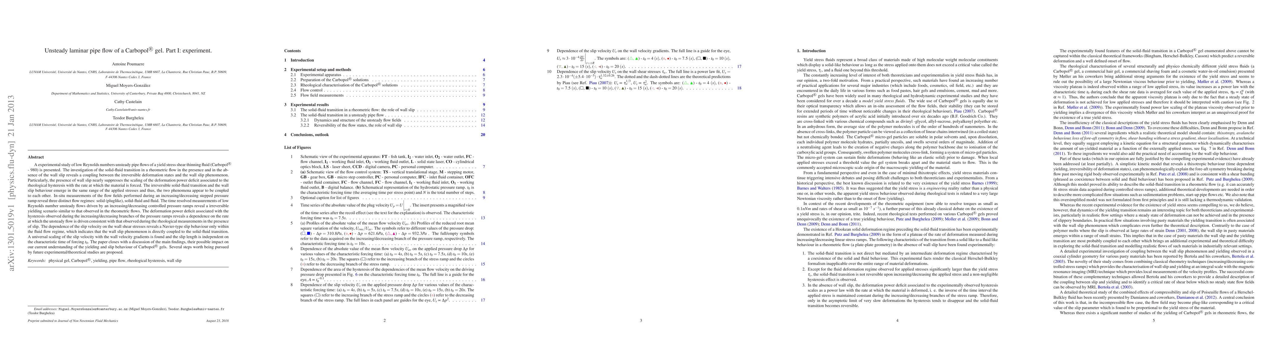 A experimental study of low Reynolds numbers unsteady pipe flows of a yield stress shear thinning fluid (Carbopol- 980) is presented. The investigation of the solid-fluid transition in a rheometric flow in the presence and in the ab- sence of the wall slip reveals a coupling between the irreversible deformation states and the wall slip phenomenon. Particularly, the presence of wall slip nearly suppresses the scaling of the deformation power deficit associated to the rheological hysteresis with the rate at which the material is forced. The irreversible solid-fluid transition and the wall slip behaviour emerge in the same range of the applied stresses and thus, the two phenomena appear to be coupled to each other. In-situ measurements of the flow fields performed during an increasing/decreasing stepped pressure ramp reveal three distinct flow regimes: solid (pluglike), solid-fluid and fluid. The deformation power deficit associated with the hysteresis observed during the increasing/decreasing branches of the pressure ramps reveals a dependence on the rate at which the unsteady flow is driven consistent with that observed during the rheological measurements in the presence of slip. The dependence of the slip velocity on the wall shear stresses reveals a Navier-type slip behaviour only within the fluid flow regime, which indicates that the wall slip phenomenon is directly coupled to the solid-fluid transition. A universal scaling of the slip velocity with the wall velocity gradients is found and the slip length is independent on the characteristic time of forcing t0. The paper closes with a discussion of the main findings, their possible impact on our current understanding of the yielding and slip behaviour of Carbopol gels. Several steps worth being pursued by future experimental/theoretical studies are proposed.