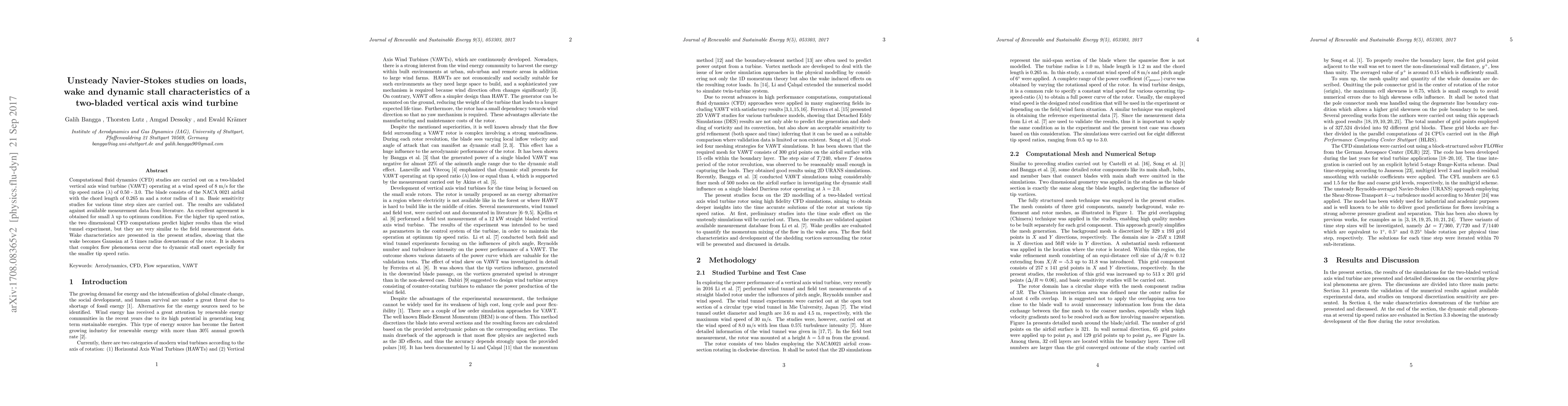 This paper uses CFD to analyze the unsteady loads, wake, and dynamic stall characteristics of a two-bladed vertical axis wind turbine at various tip speed ratios. The results show good agreement with literature data up to the optimal tip speed ratio, highlighting complex flow phenomena due to dynamic stall.
