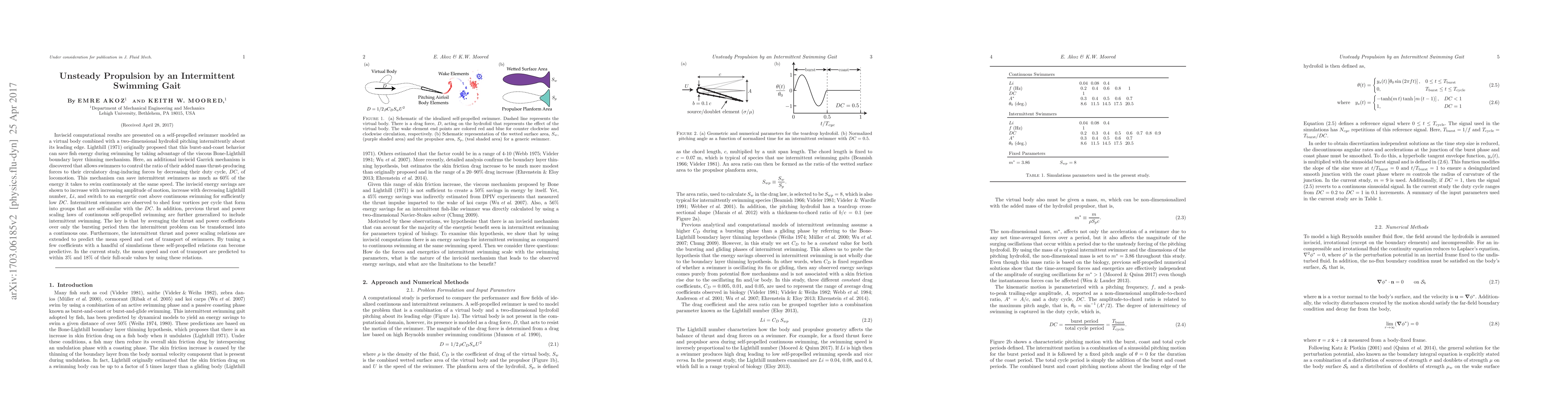 Inviscid computational results are presented on a self-propelled swimmer modeled as a virtual body combined with a two-dimensional hydrofoil pitching intermittently about its leading edge. Lighthill (1971) originally proposed that this burst-and-coast behavior can save fish energy during swimming by taking advantage of the viscous Bone-Lighthill boundary layer thinning mechanism. Here, an additional inviscid Garrick mechanism is discovered that allows swimmers to control the ratio of their added mass thrust-producing forces to their circulatory drag-inducing forces by decreasing their duty cycle, DC, of locomotion. This mechanism can save intermittent swimmers as much as 60% of the energy it takes to swim continuously at the same speed. The inviscid energy savings are shown to increase with increasing amplitude of motion, increase with decreasing Lighthill number, Li, and switch to an energetic cost above continuous swimming for sufficiently low DC. Intermittent swimmers are observed to shed four vortices per cycle that form into groups that are self-similar with the DC. In addition, previous thrust and power scaling laws of continuous self-propelled swimming are further generalized to include intermittent swimming. The key is that by averaging the thrust and power coefficients over only the bursting period then the intermittent problem can be transformed into a continuous one. Furthermore, the intermittent thrust and power scaling relations are extended to predict the mean speed and cost of transport of swimmers. By tuning a few coefficients with a handful of simulations these self-propelled relations can become predictive. In the current study, the mean speed and cost of transport are predicted to within 3% and 18% of their full-scale values by using these relations.