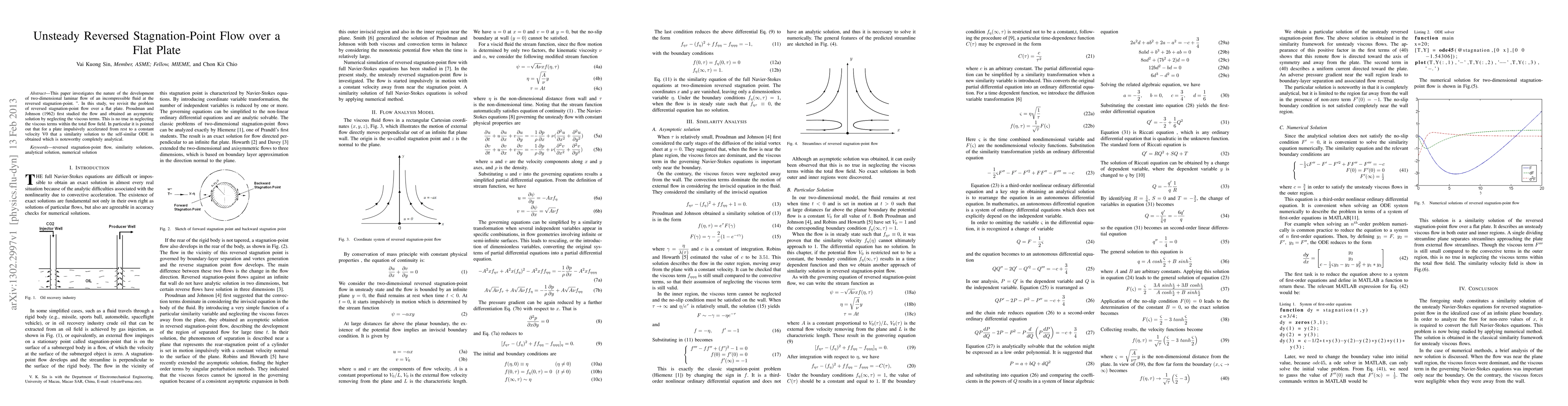 This paper investigates the nature of the development of two-dimensional laminar flow of an incompressible fluid at the reversed stagnation-point. ". In this study, we revisit the problem of reversed stagnation-point flow over a flat plate. Proudman and Johnson (1962) first studied the flow and obtained an asymptotic solution by neglecting the viscous terms. This is no true in neglecting the viscous terms within the total flow field. In particular it is pointed out that for a plate impulsively accelerated from rest to a constant velocity V0 that a similarity solution to the self-similar ODE is obtained which is noteworthy completely analytical.