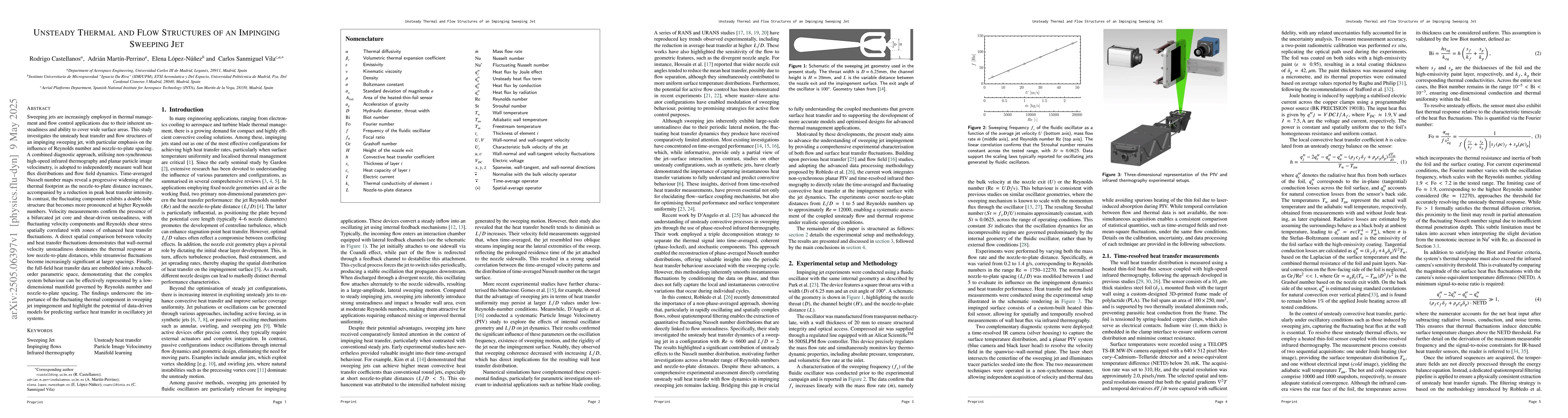 A study investigates the unsteady heat transfer and flow structures of an impinging sweeping jet, revealing how nozzle-to-plate spacing affects thermal footprint and peak heat transfer intensity, with significant fluctuations at higher Reynolds numbers.