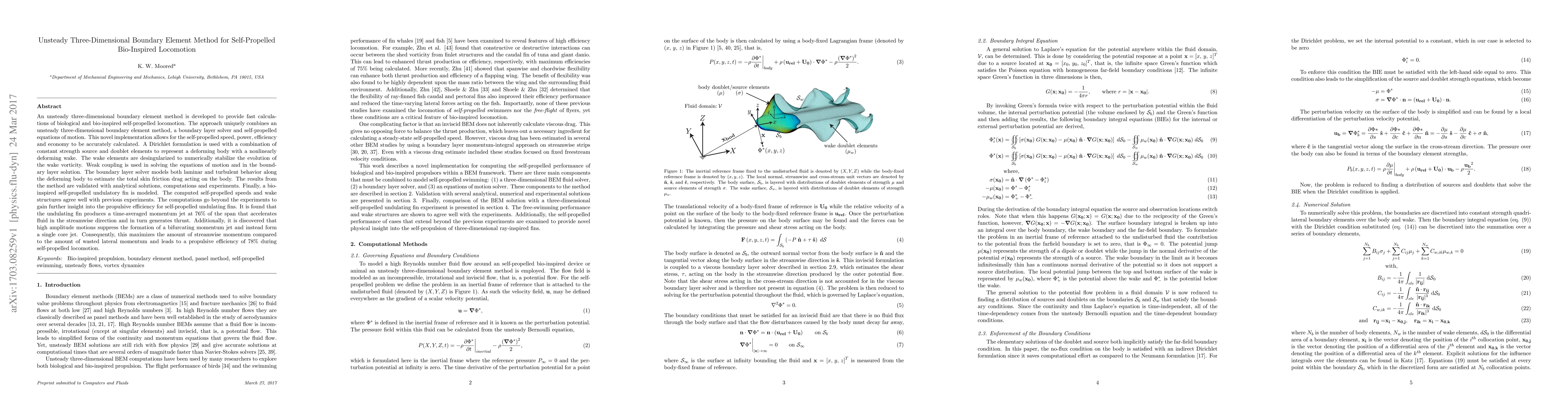This paper develops an unsteady three-dimensional boundary element method for calculating self-propelled bio-inspired locomotion, combining it with a boundary layer solver to model both laminar and turbulent behavior. The method accurately calculates self-propelled speed, power, and efficiency, and validates the results with experiments, showing a propulsive efficiency of 78% for undulating fins.