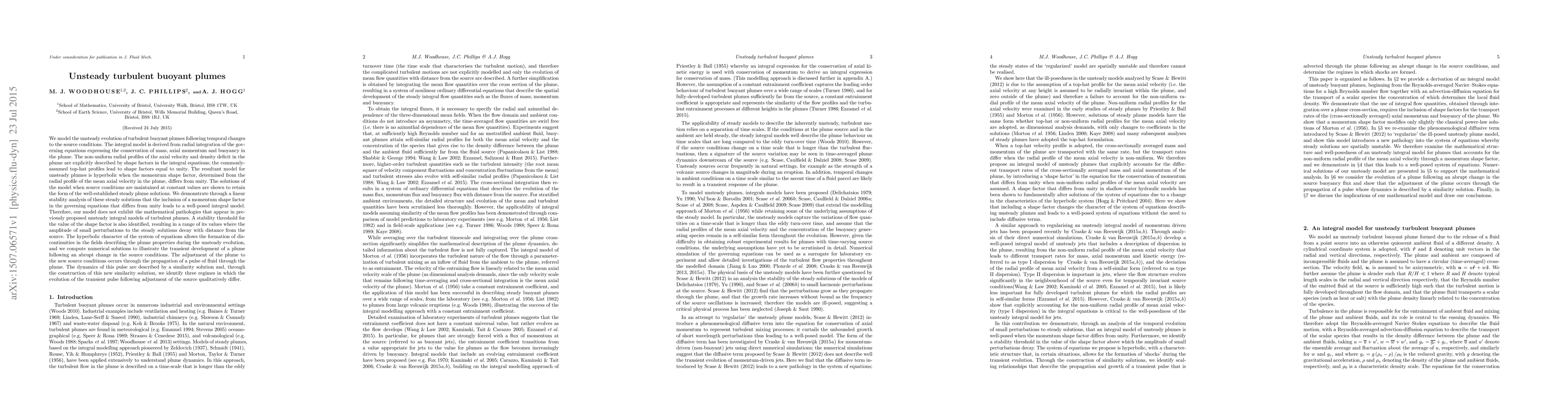This paper models the unsteady evolution of turbulent buoyant plumes under temporal changes in source conditions using an integral model derived from radial integration of conservation equations. The model incorporates non-uniform radial profiles and identifies a stability threshold for shape factors, allowing for the formation of discontinuities and the identification of three distinct regimes in the transient pulse dynamics following source adjustments.