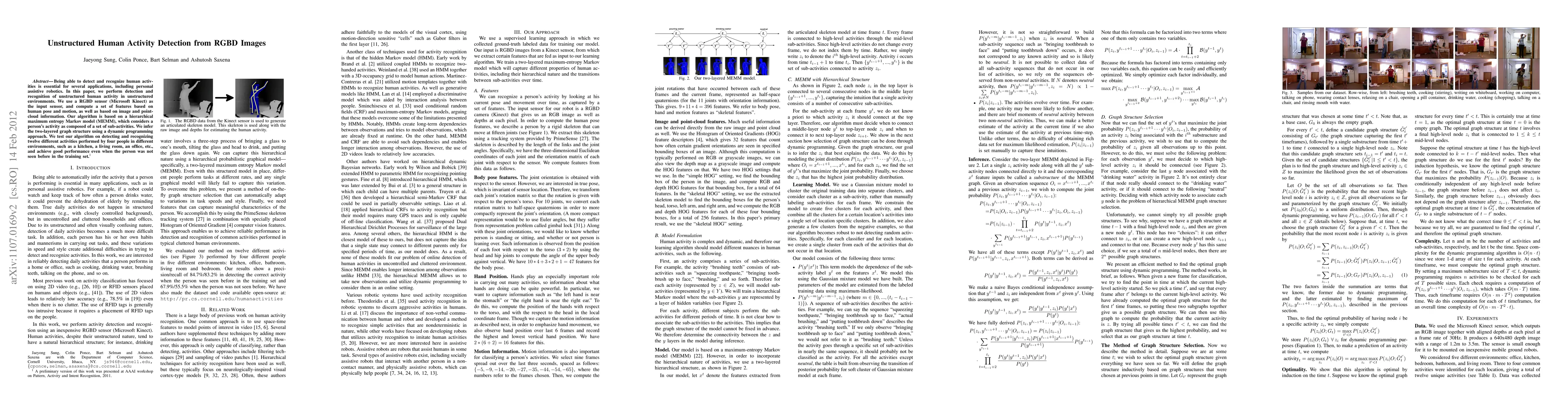 Being able to detect and recognize human activities is essential for several applications, including personal assistive robotics. In this paper, we perform detection and recognition of unstructured human activity in unstructured environments. We use a RGBD sensor (Microsoft Kinect) as the input sensor, and compute a set of features based on human pose and motion, as well as based on image and pointcloud information. Our algorithm is based on a hierarchical maximum entropy Markov model (MEMM), which considers a person's activity as composed of a set of sub-activities. We infer the two-layered graph structure using a dynamic programming approach. We test our algorithm on detecting and recognizing twelve different activities performed by four people in different environments, such as a kitchen, a living room, an office, etc., and achieve good performance even when the person was not seen before in the training set.