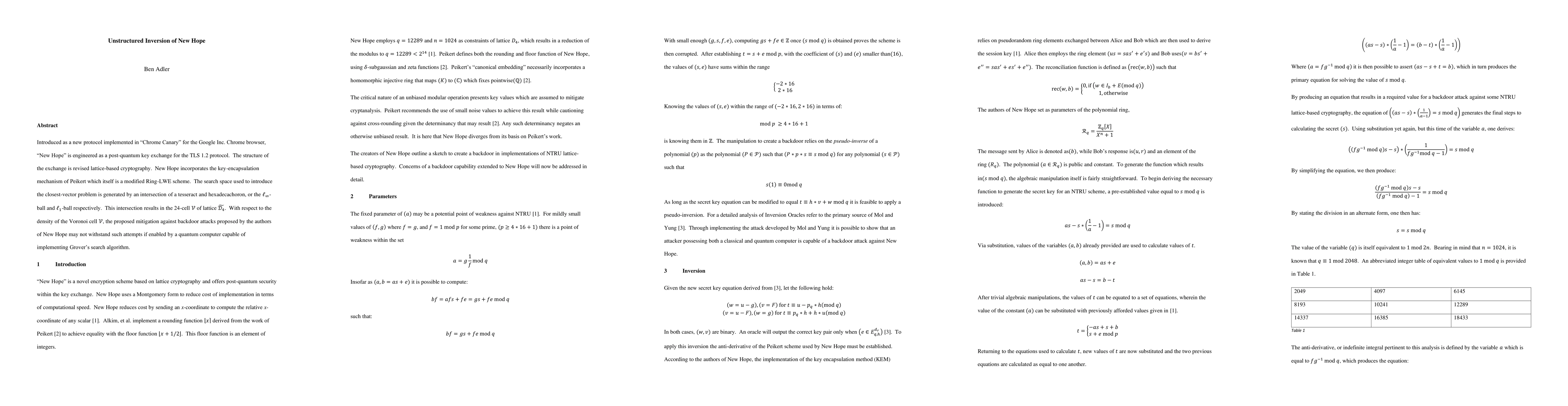 Introduced as a new protocol first implemented in Google Chrome Canary, New Hope is engineered as post-quantum cryptography for the TLS 1.2 protocol. The structure of the exchange is lattice based, implementing Peikert's key encapsulation mechanism as a modified form of ring learning with errors. The search space used to introduce the closest-vector problem is generated by the intersection of a tesseract and hexadecachoron. This intersection results in a 24-cell Voronoi tessellation. With respect to this tessellation, New Hope may not withstand inversion attempts augmented with Grover's search algorithm.