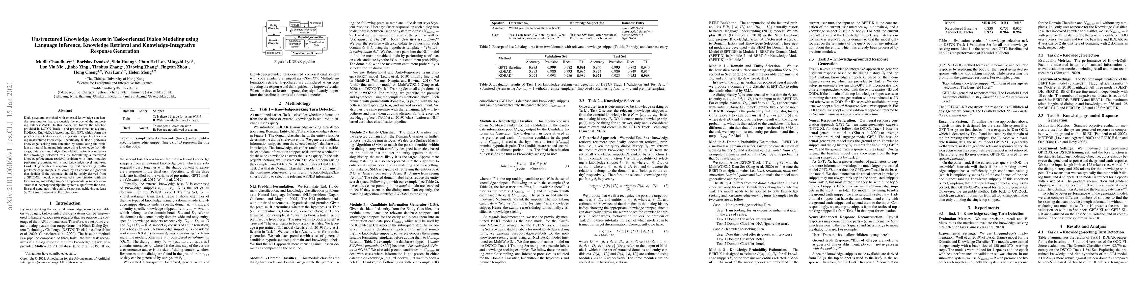 This paper proposes a task-oriented dialog system with three subsystems—KDEAK, KnowleDgEFactor, and Ens-GPT—to access unstructured knowledge. The system outperforms the baseline, achieving a 58.77% improvement in BLEU-4 score by integrating knowledge retrieval and response generation.