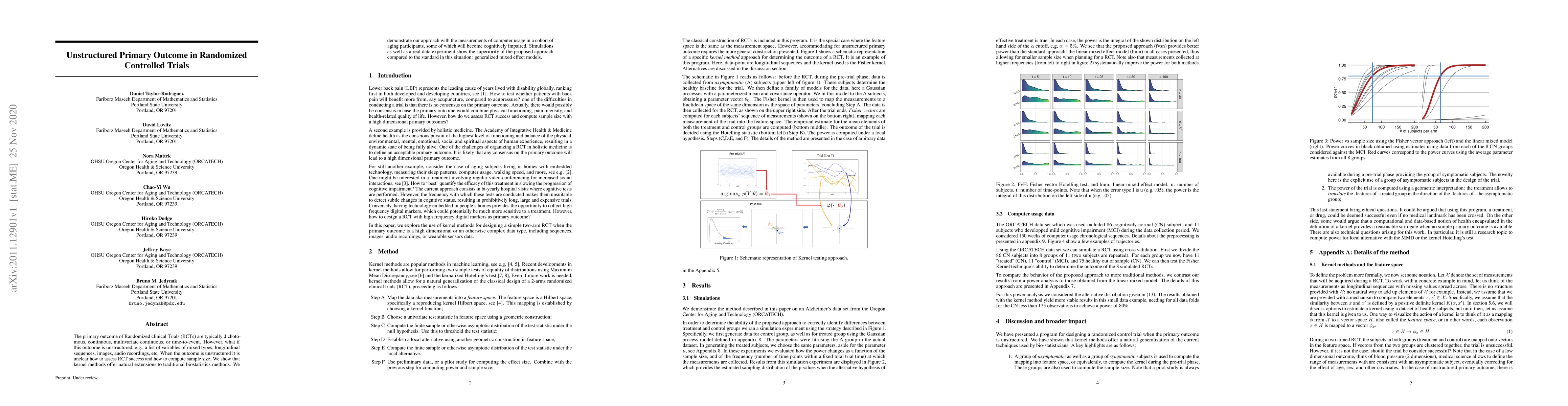 The primary outcome of Randomized clinical Trials (RCTs) are typically dichotomous, continuous, multivariate continuous, or time-to-event. However, what if this outcome is unstructured, e.g., a list of variables of mixed types, longitudinal sequences, images, audio recordings, etc. When the outcome is unstructured it is unclear how to assess RCT success and how to compute sample size. We show that kernel methods offer natural extensions to traditional biostatistics methods. We demonstrate our approach with the measurements of computer usage in a cohort of aging participants, some of which will become cognitively impaired. Simulations as well as a real data experiment show the superiority of the proposed approach compared to the standard in this situation: generalized mixed effect models.