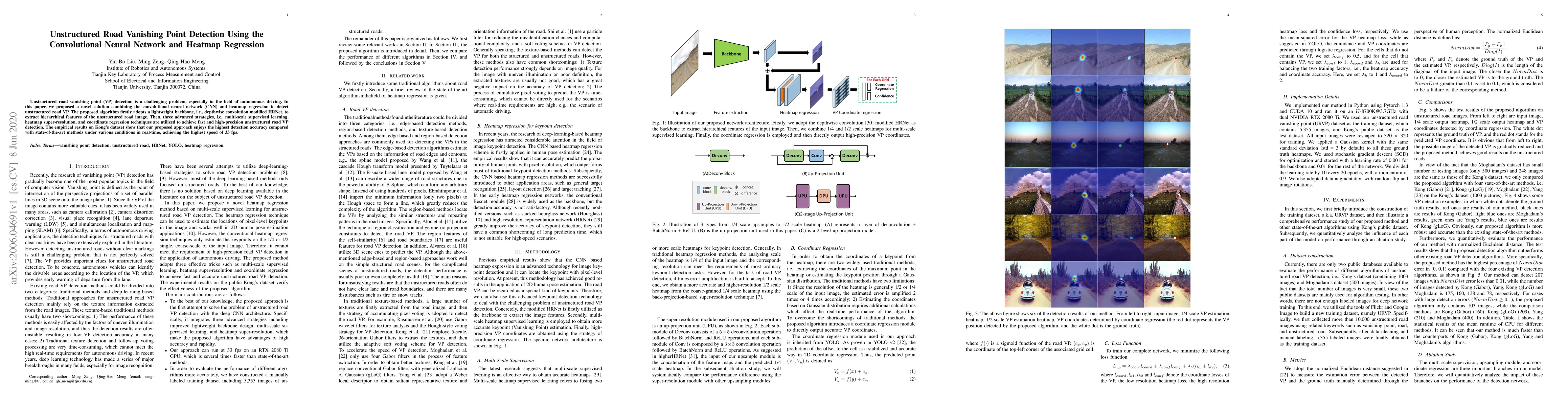 This paper proposes a CNN-based method combining heatmap regression for detecting vanishing points in unstructured road images. The approach uses a lightweight HRNet backbone and advanced strategies for high-precision and fast detection, achieving superior accuracy and speed on Kong's dataset.