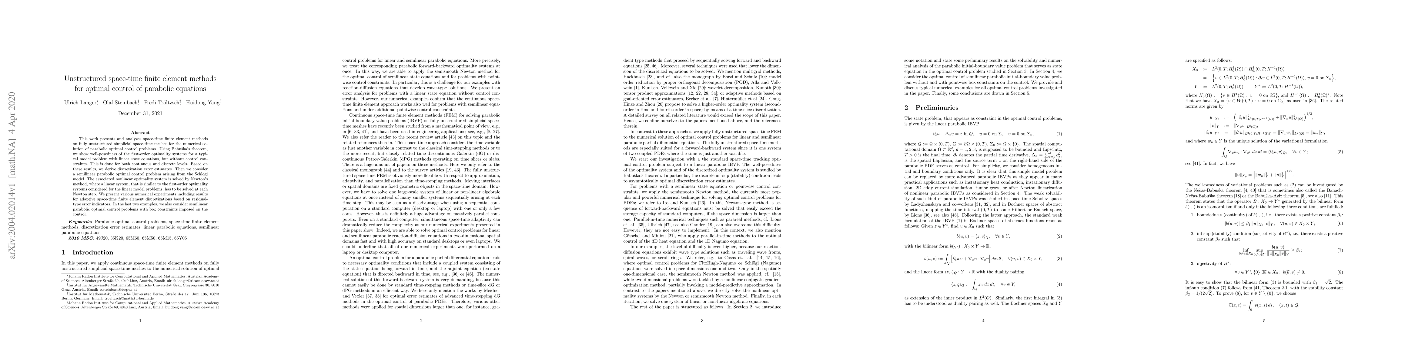This paper develops and analyzes space-time finite element methods for solving optimal control problems of parabolic equations on unstructured meshes. It establishes well-posedness and derives discretization error estimates, then applies these methods to solve semilinear parabolic problems, including those with control constraints.