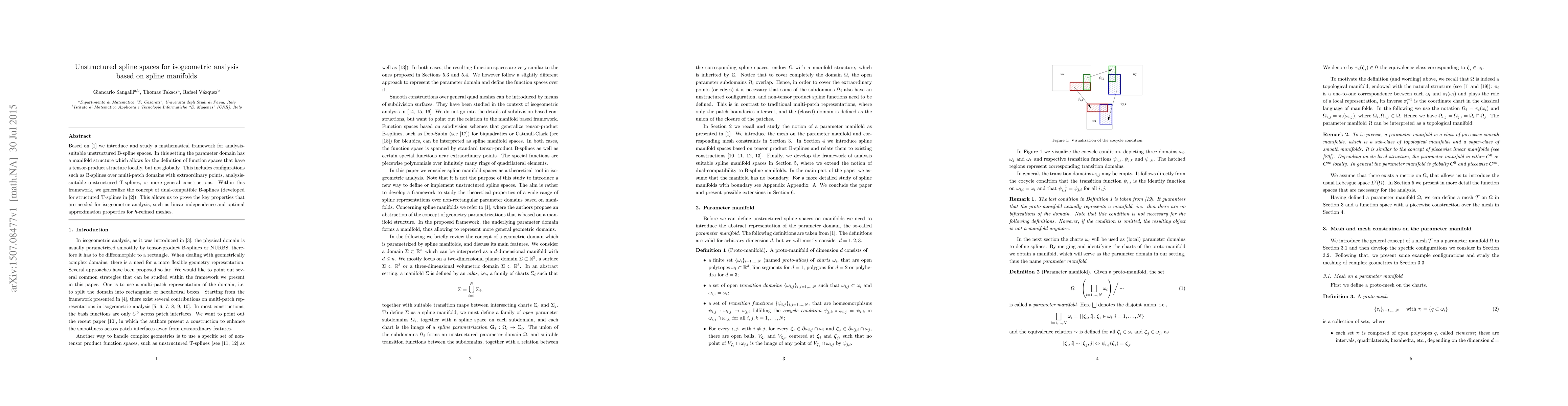 This paper introduces a mathematical framework for unstructured B-spline spaces based on spline manifolds, enabling the definition of tensor-product structured function spaces locally. It generalizes dual-compatible B-splines for unstructured T-splines, proving essential properties for isogeometric analysis.