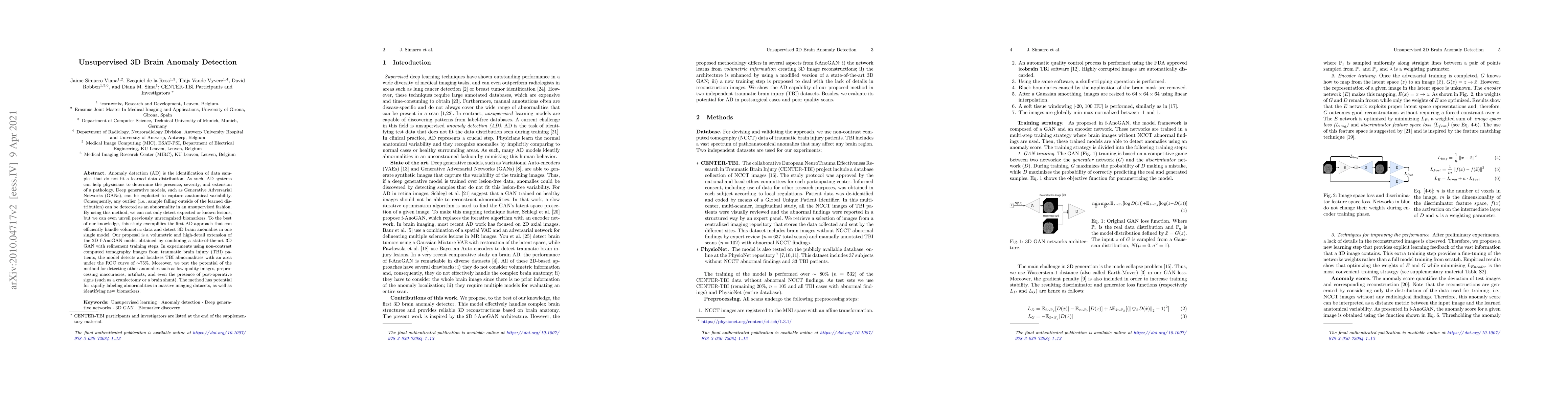 This research introduces an unsupervised 3D anomaly detection method for brain images using a volumetric GAN model, successfully detecting traumatic brain injury abnormalities in CT scans with an AUC of ~75%. The approach also shows promise in identifying other anomalies like artifacts and post-operative signs, potentially aiding in rapid labeling of massive imaging datasets and discovery of new biomarkers.