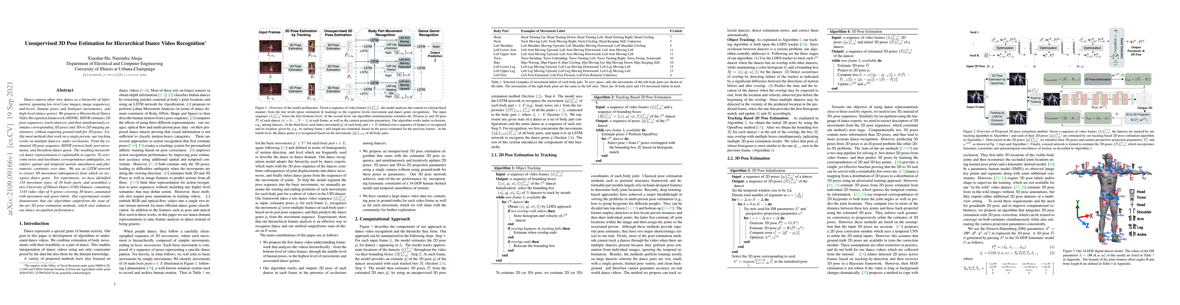 This paper proposes a Hierarchical Dance Video Recognition framework (HDVR) for unsupervised 3D pose estimation and dance genre recognition. HDVR estimates 3D poses and tracks multiple dancers, extracting dance genre from 3D pose sequences, outperforming existing methods.