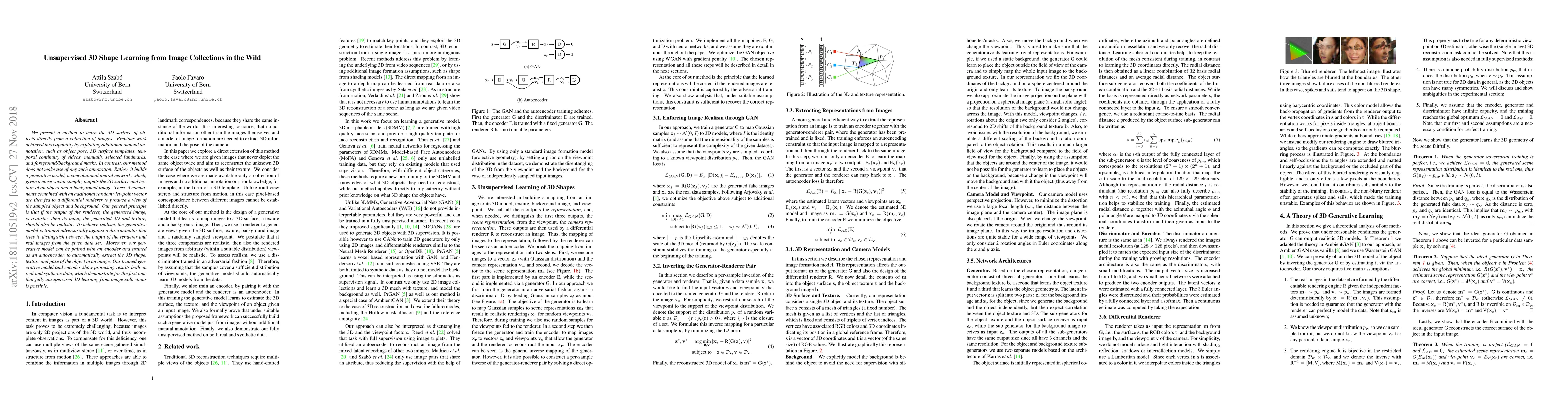 We present a method to learn the 3D surface of objects directly from a collection of images. Previous work achieved this capability by exploiting additional manual annotation, such as object pose, 3D surface templates, temporal continuity of videos, manually selected landmarks, and foreground/background masks. In contrast, our method does not make use of any such annotation. Rather, it builds a generative model, a convolutional neural network, which, given a noise vector sample, outputs the 3D surface and texture of an object and a background image. These 3 components combined with an additional random viewpoint vector are then fed to a differential renderer to produce a view of the sampled object and background. Our general principle is that if the output of the renderer, the generated image, is realistic, then its input, the generated 3D and texture, should also be realistic. To achieve realism, the generative model is trained adversarially against a discriminator that tries to distinguish between the output of the renderer and real images from the given data set. Moreover, our generative model can be paired with an encoder and trained as an autoencoder, to automatically extract the 3D shape, texture and pose of the object in an image. Our trained generative model and encoder show promising results both on real and synthetic data, which demonstrate for the first time that fully unsupervised 3D learning from image collections is possible.