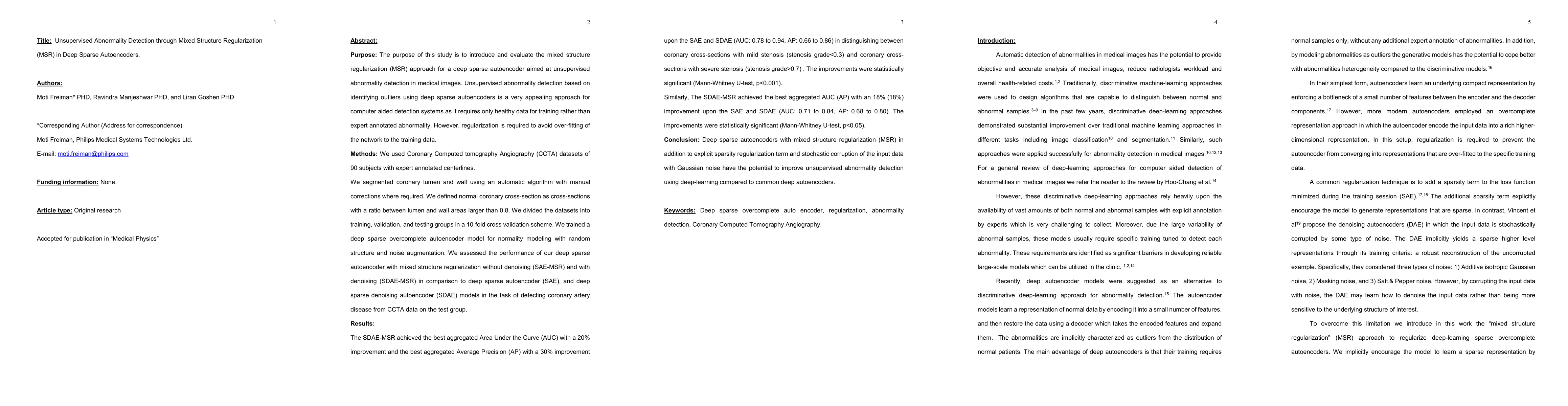 Deep sparse auto-encoders with mixed structure regularization (MSR) in addition to explicit sparsity regularization term and stochastic corruption of the input data with Gaussian noise have the potential to improve unsupervised abnormality detection. Unsupervised abnormality detection based on identifying outliers using deep sparse auto-encoders is a very appealing approach for medical computer aided detection systems as it requires only healthy data for training rather than expert annotated abnormality. In the task of detecting coronary artery disease from Coronary Computed Tomography Angiography (CCTA), our results suggests that the MSR has the potential to improve overall performance by 20-30% compared to deep sparse and denoising auto-encoders.