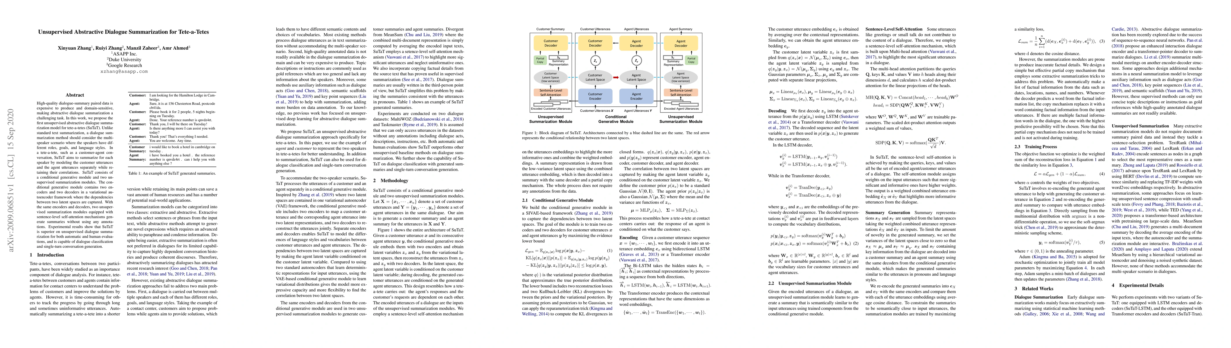 This paper proposes SuTaT, an unsupervised model for abstractive summarization of dialogues in tete-a-tete conversations, separately modeling customer and agent utterances while preserving their correlations. SuTaT uses a conditional generative module with variational autoencoders and unsupervised summarization modules for generating high-quality summaries without annotated data.