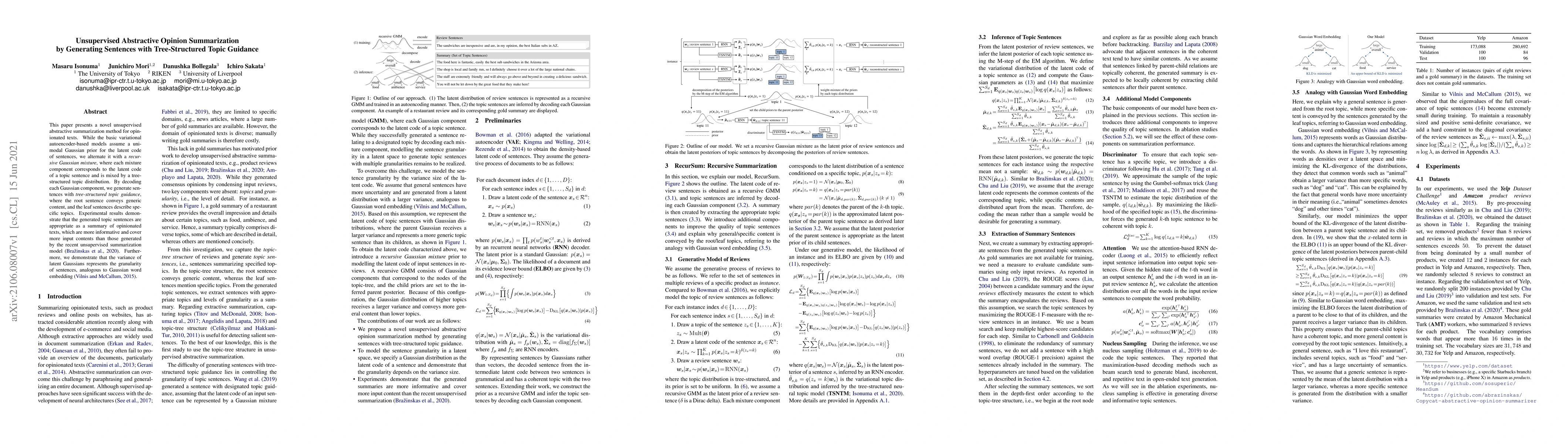This paper introduces an unsupervised method for abstractive summarization using tree-structured topic guidance, replacing unimodal Gaussian priors with recursive Gaussian mixtures for generating topic-specific sentences, leading to summaries that are more informative than previous models.